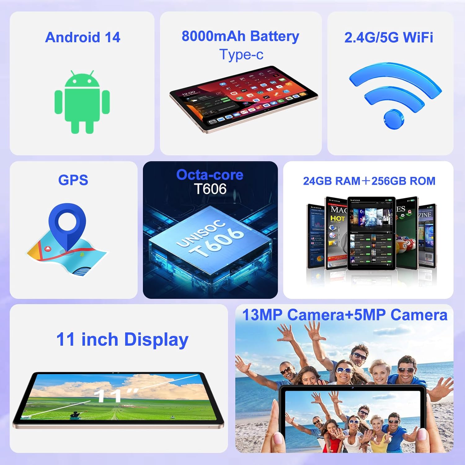 Brand SUAAT System Android 14 OS Processor Octa-Core Memory 24GB RAM 256GB ROM 1TB Expand Battery 8000 mAh Screen size 11 IN Resolution 1280×800 Camera 13MP Rear and 5MP Front Connection 5G+2.4G WIFI 6 Bluetooth 5.0 Headphone jack type 3.5mm Charging interface type Type-C Remarks Face Unlock、Parental Control Package Included Android 14 Tablet、Protective case、Tablet Charger、Tablet Charging Cable、Protective film、Box、User Manual Notes This is a WIFI tablet without SIM card slot