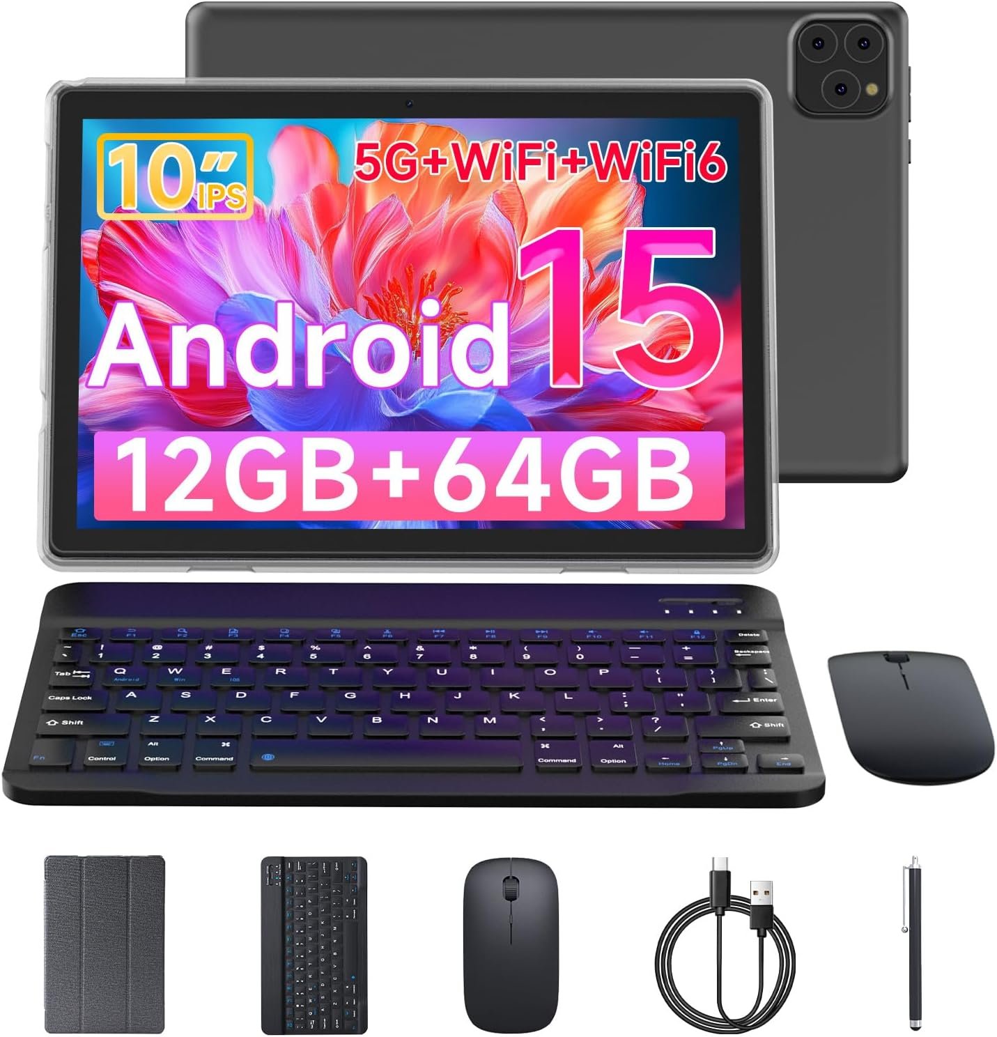 Tablet Android 15 10 Inch 12GB RAM+64GB ROM/ 2TB Expandable Tablet, 1280 * 800 HD Touch Screen, 5G WiFi6 BT 5.0, 2 in 1 Tablets with Keyboard Case Mouse Stylus (12GB RAM+64GB ROM Black)