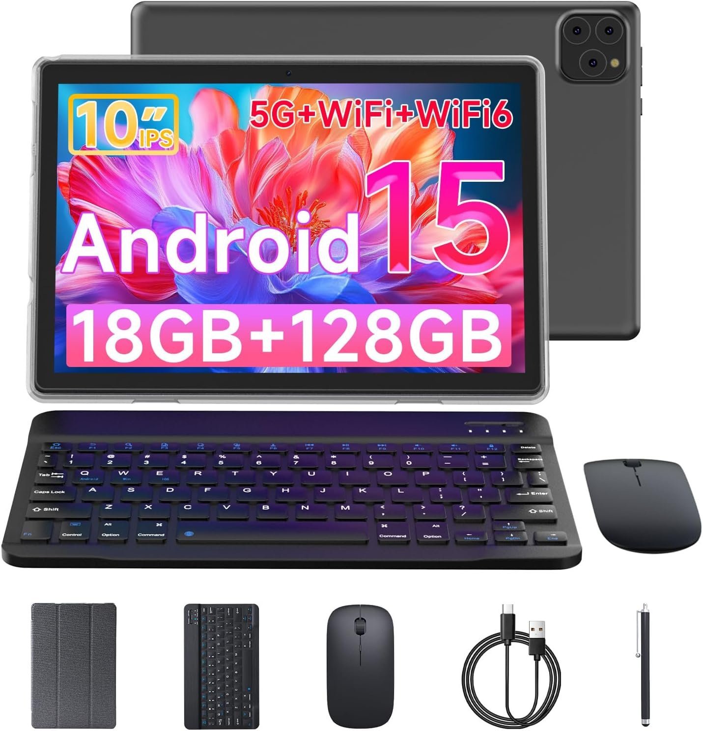 Tablet Android 15 10 Inch 18GB RAM+128GB ROM/ 2TB Expandable Tablet, 1280 * 800 HD Touch Screen, 5G WiFi6 BT 5.0, 2 in 1 Tablets with Keyboard Case Mouse Stylus (Black)