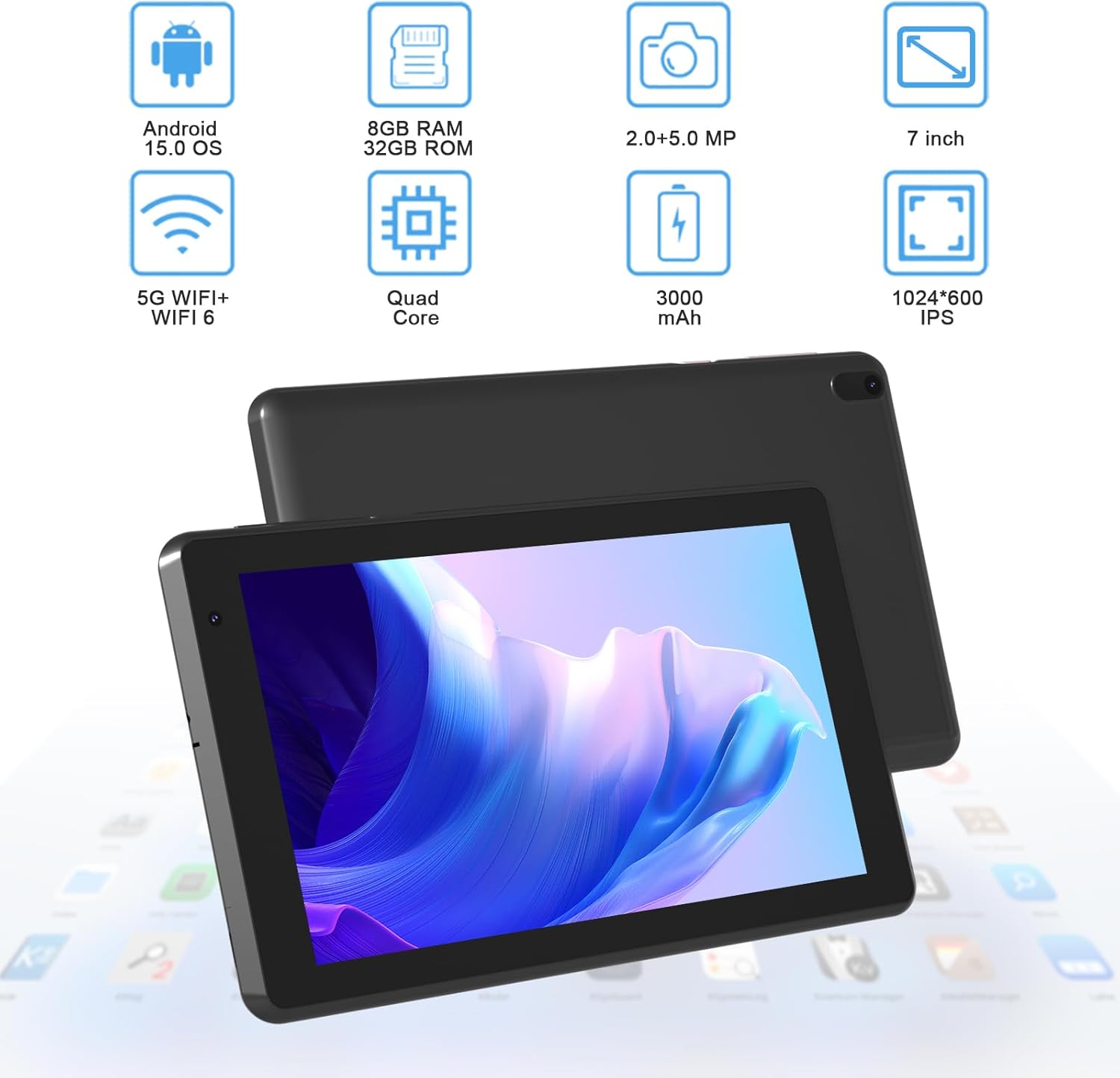 Tablet Android 15 Tablets with Case 7 inch, 8GB RAM, 32GB ROM Support 1TB Expand Computer Tablet PC, Quad-Core Processor, IPS Touch Screen, 2+5MP Dual Camera, 3000mah Battery, Wifi Tableta (Black)