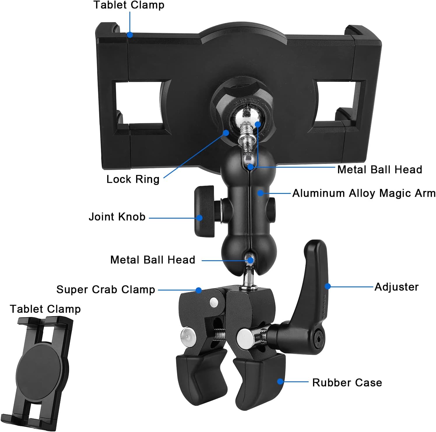 【Sturdy & Anti-scratch】:Tablet mount arm are made up of super crab clamp and articulating magic arm,both of them are aluminum alloy and stainless steel material,sturdy,durable,super crab clamp built-in rubber pad to anti-scratch,clamped the pole tightly,tablet clamp is high quality of ABS material,clamp feet built- in rubber pad to hold iPad firmly.