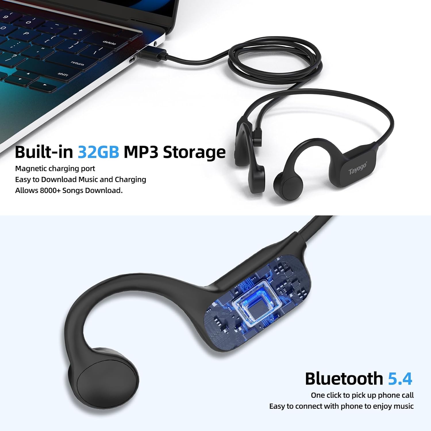[Bluetooth 5.4 &32GB of MP3 Player ] Bone conduction earbuds come with Bluetooth 5.4 chip to provide a faster more stable connection. Effortlessly control your music and calls with easy one-key control.It supports multiple devices connection,such as cell phones, pads, laptops and etc.You can also easily download MP3 by connecting the magnetic charging cable to your computer. 32G memory supports you download 4000+ songs
