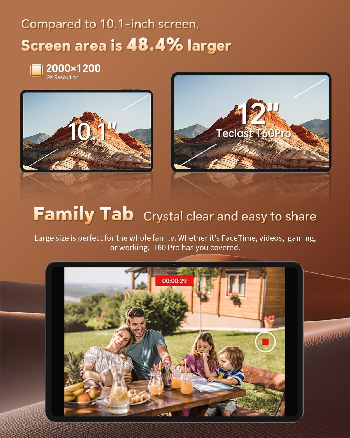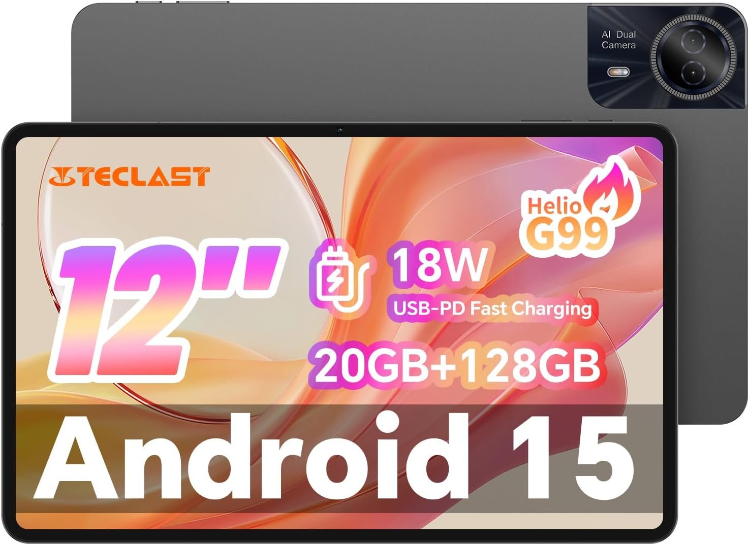 TECLAST T60Pro 2K Tablet 12” Android 15 Tablet, 20GB+128GB(1TB TF), 8 core G99, 8000mAh/15W Fast Charge, 2.4GHz+5GHz WiFi, GPS, Four Speakers, Widevine L1, Exclusive Keyboard connectable