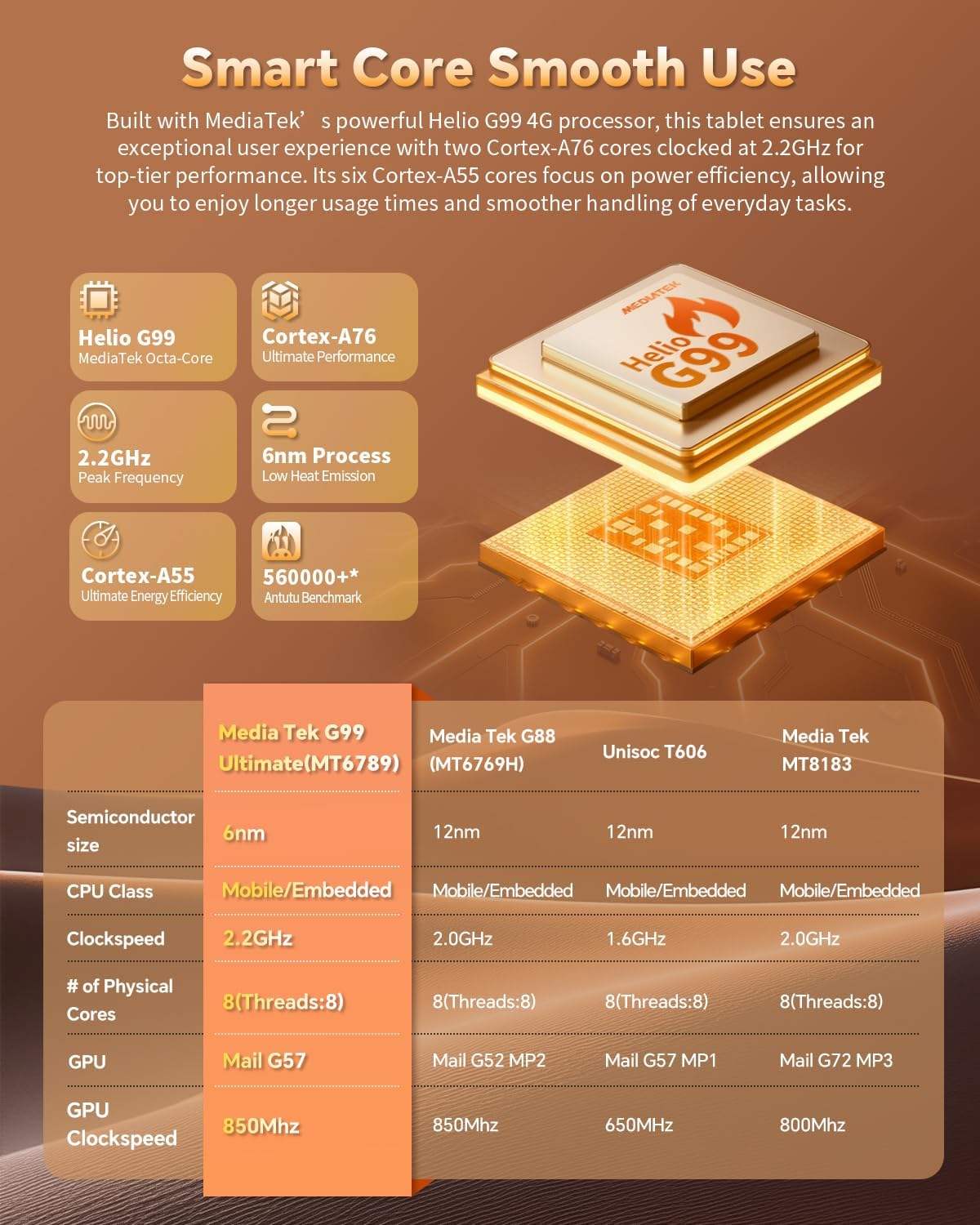 【Android 15+8-core Helio G99 processor】 The Android 15 tablet operating system continues to offer straightforward operation and comprehensive user permission management, with additional personalisation and functionality optimisations. Android 15 supports split-screen operation, enabling you to launch apps quickly via the navigation Bar and run them simultaneously. The MTK 8-core Helio G99 processor enhances the tablet’s performance. With the Mali-G57 GPU, provides stunning visual effects and a smoother, more fluid experience as gaming tablet. Also enables you to set up parental controls to limit children’s usage time and permissions.
