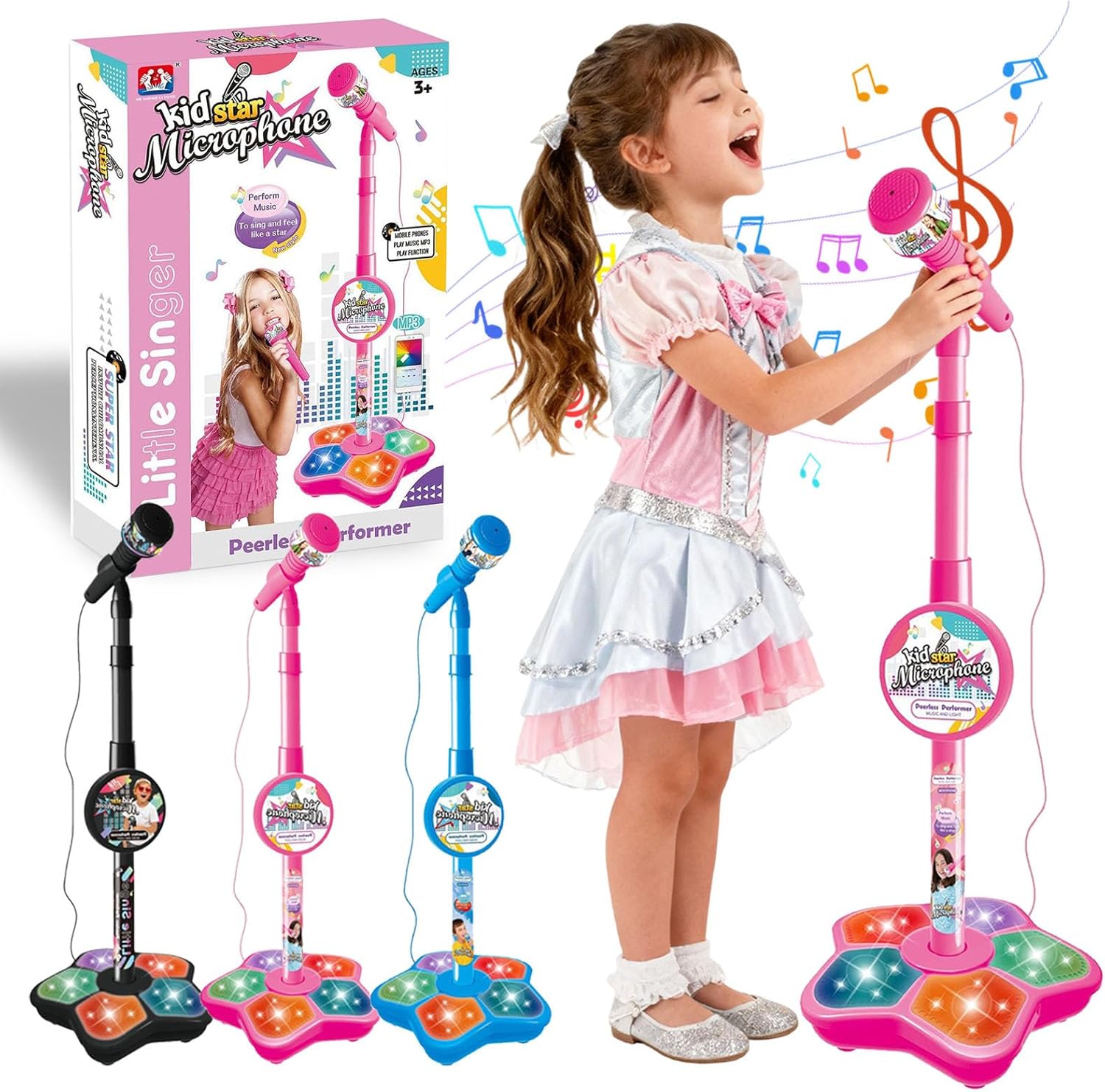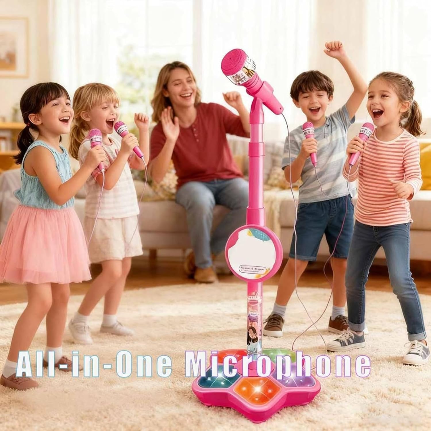 The All-in-One Microphone Toy, Kids Microphone with Stand Adjustable, Speaker & Led Lights, Fun Standing Karaoke Microphone – Move to Play & Echo Effect, for Phones/MP3/Tablets, (Pink)