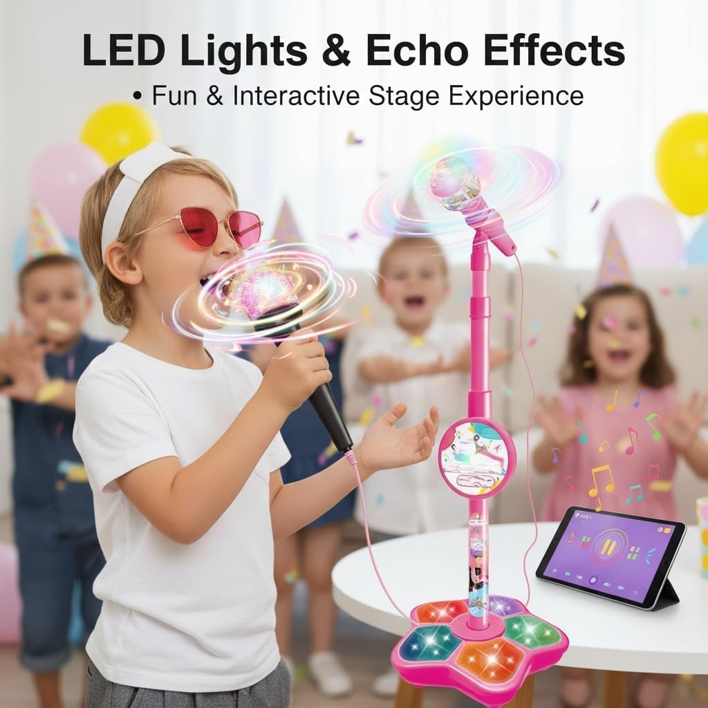 The All-in-One Microphone Toy, Portable Kids Karaoke Machine, Kids Microphones with Stand, with Flashing Stage Lights and Pedals, Guitar Toys for Fun Musical Effects (Pink, Microphone)