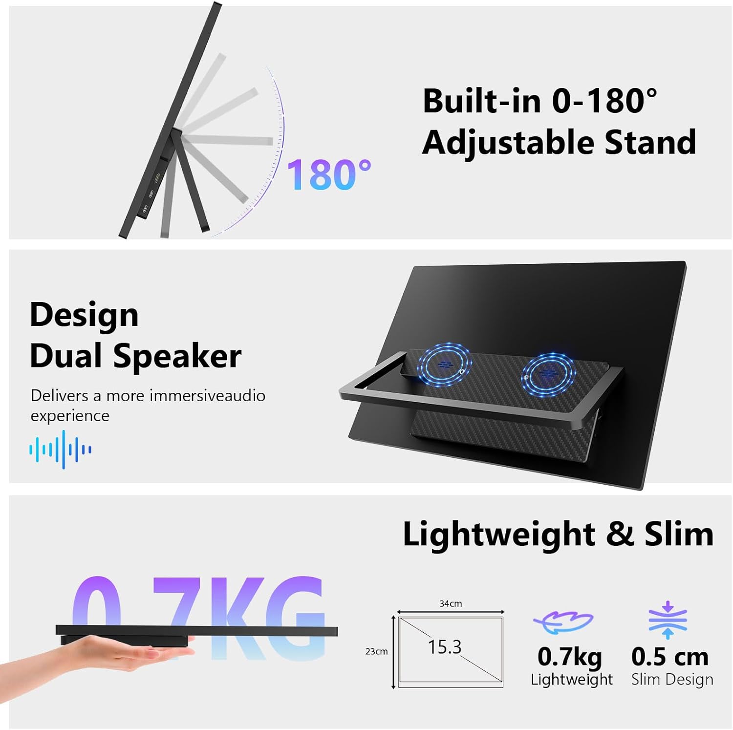 【Built-in Stand & Dual Speakers】Ready to use straight out of the box, no additional accessories required. The innovative built-in stand adjusts effortlessly to your preferred viewing angle, freeing your hands. Integrated dual high-fidelity stereo speakers deliver crystal-clear audio without the need for external speakers. Its ultra-slim, lightweight design makes it the perfect mobile companion for boosting productivity or enhancing entertainment, whether placed in your office or study, or carried in your bag.