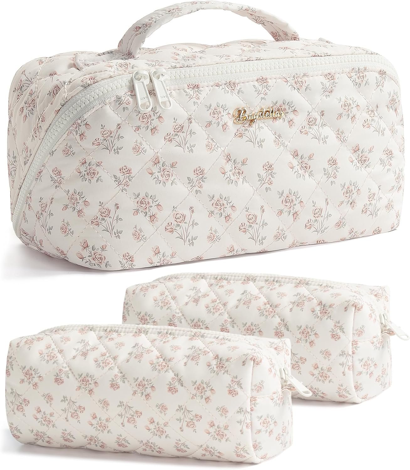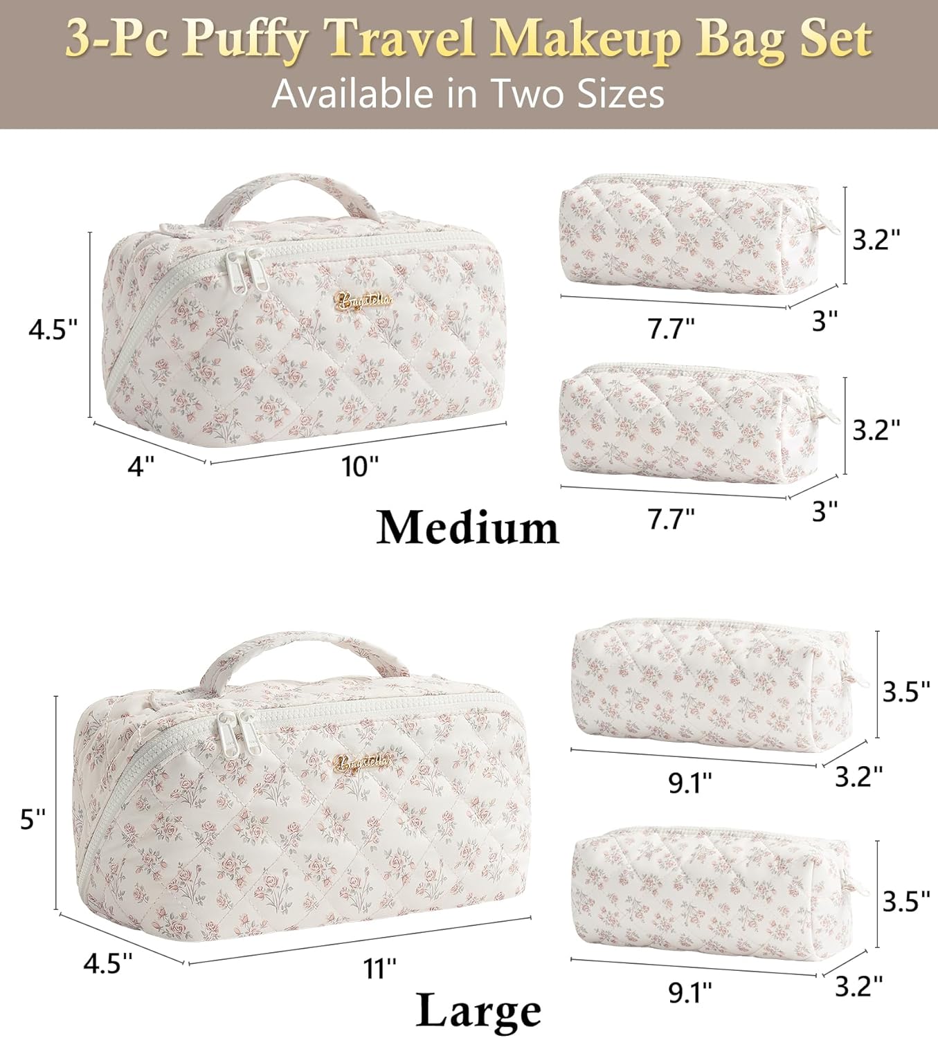 Travel Makeup Bag, 3 Pcs Large Capacity Puffy Toiletry Bag for Women, Open Flat Make up Cosmetic Organizer w/Handle & Clear Divider Water-resistant Portable Pouch Travel Essentials, L-Beige Rose
