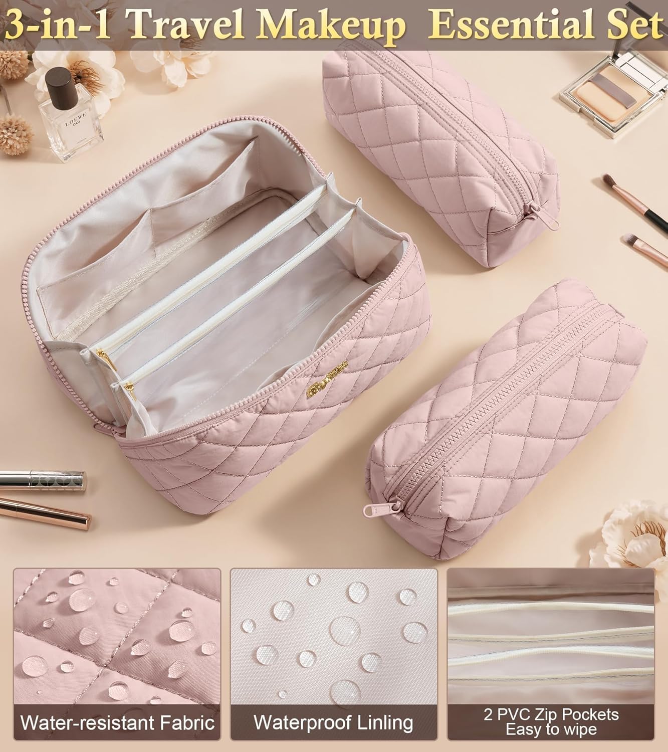 3 PCS TRAVEL MAKEUP BAG SET: Discover smart travel with Bagstellar 3-piece makeup set. This travel essentials set includes a main cosmetic bag and 2 detachable small bags that can be used together or individually. Enjoy the flexibility to organize your essentials and free up space. Perfect for business trips, weekend getaways, or daily use, this women travel makeup case ensures your makeup & skincare remain tidy and accessible wherever you go – the ultimate solution for streamlined organization
