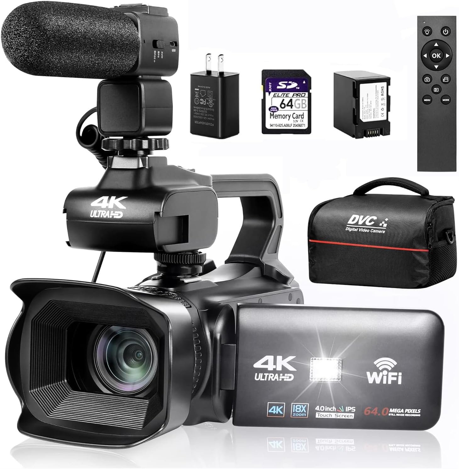 Upgrade 4K UHD Video Camera Camcorder with Mic, 18X Digital Zoom Auto-Focus Vlogging Camera for YouTube Antishake Video Recorder with 4″ Rotating Touch Screen, 64GB SD Card and Battery