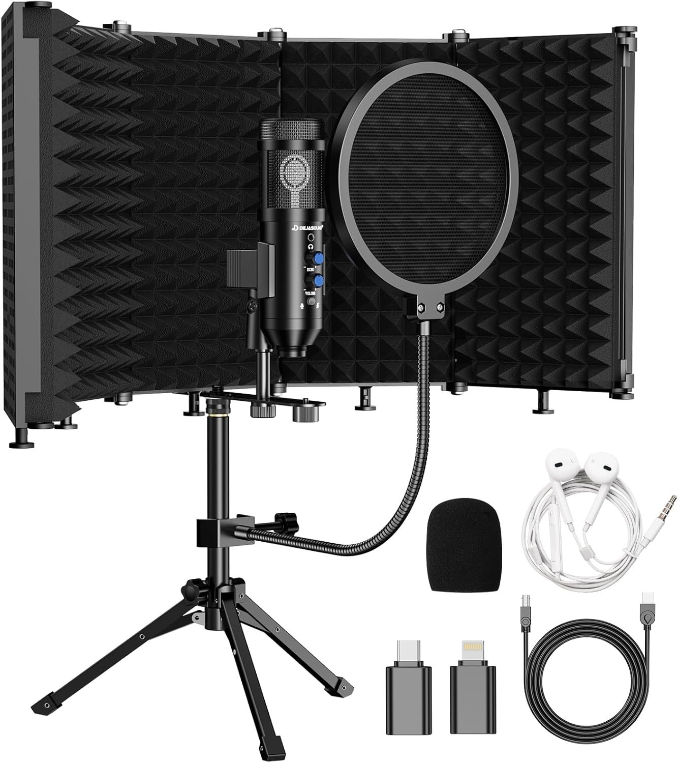 【Foldable Isolation Shield】The microphone isolation shield is made of 5 high-density sound-absorbing panels with a triple acoustic design. Each panel is foldable and adjustable, ensuring optimal noise reduction for podcasting, recording vocals, and music production. The compact design of the DJM5 makes it easy to carry and set up anywhere. This product comes with isolation shields in black, rose gold, and white, allowing you to choose the color that best matches your style