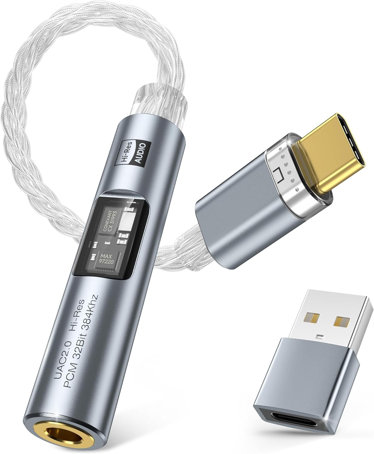 USB C to 3.5mm DAC Dongle with Dual Chip CX31993 MAX97220, HiFi Headphone Amplifier, 32Bit/384kHz Hi-Res Audio, Includes USB-A Adapter for iPhone 17/16/15,Android,PC,Mac,iPad,PS5