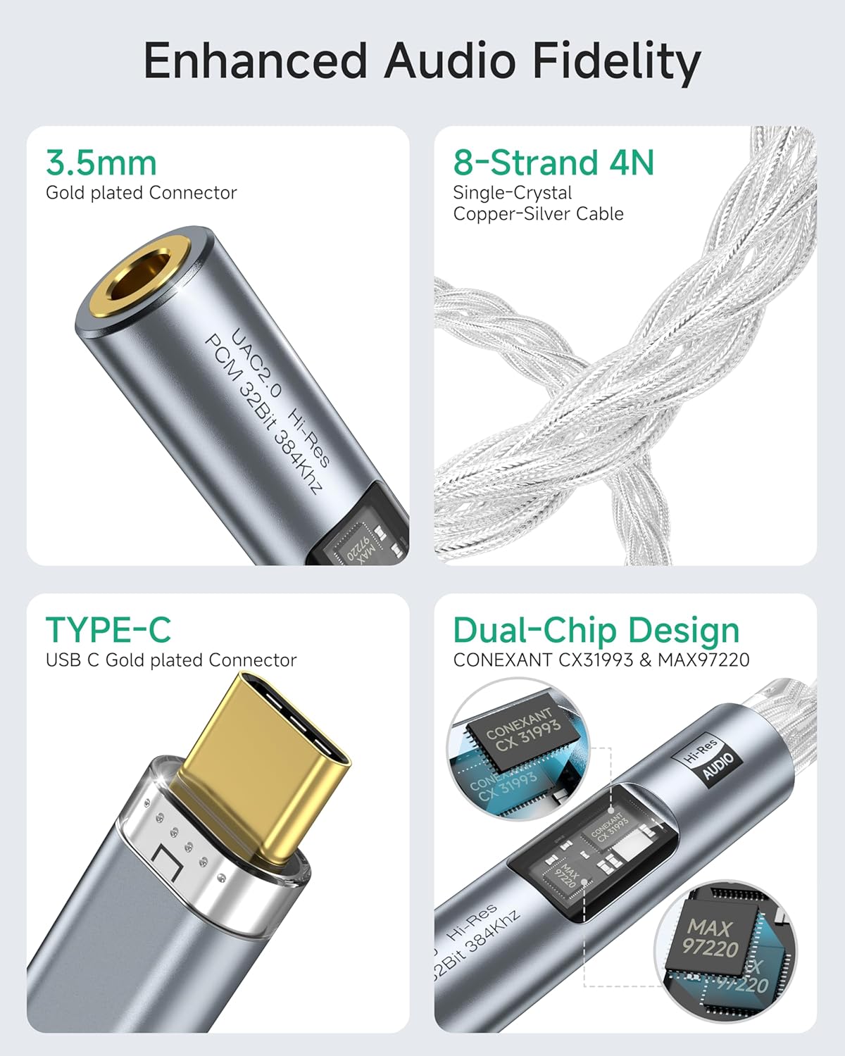 Hi-Res Audio & Dual-Chip Clarity: Experience studio-grade sound with our officially Hi-Res Audio certified USB C DAC. The advanced dual-chip architecture (CX31993 & MAX97220) delivers exceptional 32-bit/384kHz decoding, offering unparalleled clarity, detailed soundstage, and authentic vocal reproduction for both music and gaming