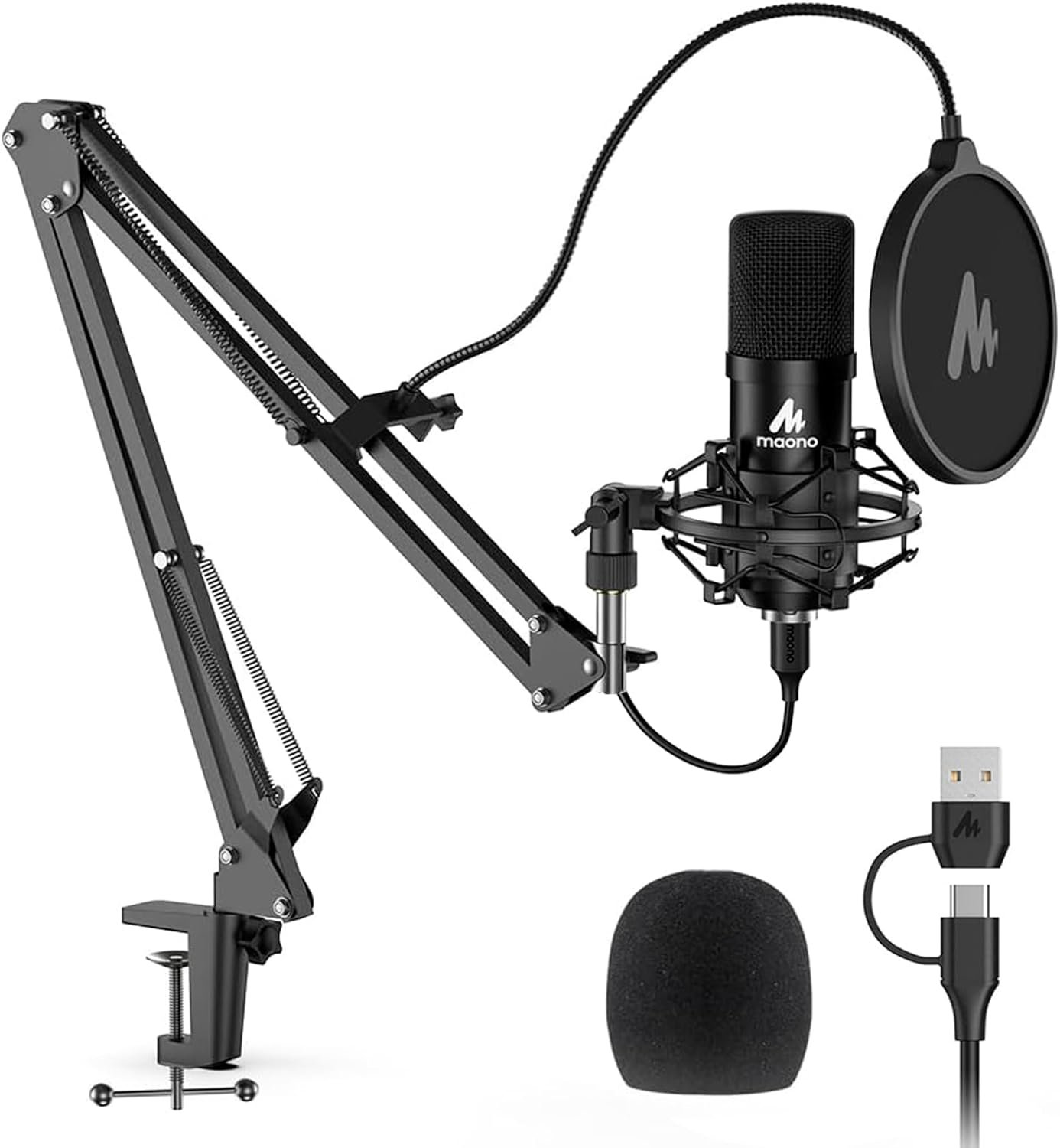 What You Get: The USB podcast microphone set package includes, Condenser Mic*1, Adjustable Scissor Arm Stand*1, Metal Shock Mount*1, Pop Filter*1, Mic Windscreen Foam*1, Boom Arm Base*1, USB-A/USB-C to USB-B Cable*1, User Manual*1