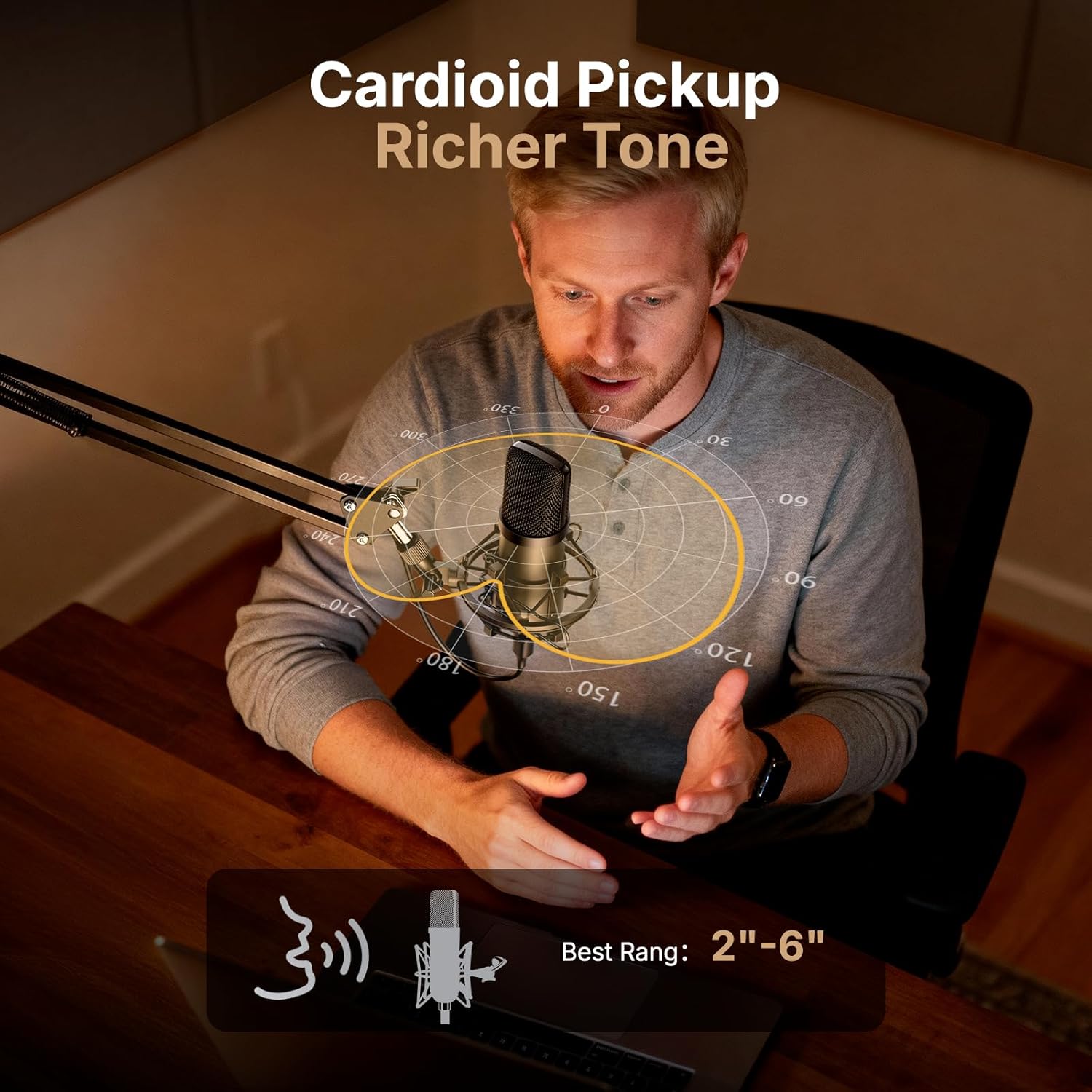 16mm Condenser Mic: With the 16mm electret condenser transducer, the USB microphone can give you a strong bass response. This professional condenser microphone picks up crystal clear audio. The magnet ring, on the USB microphone cable, has a strong anti-interference function, which gives you a better feel