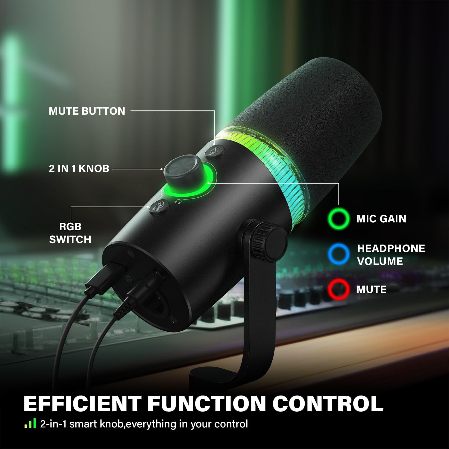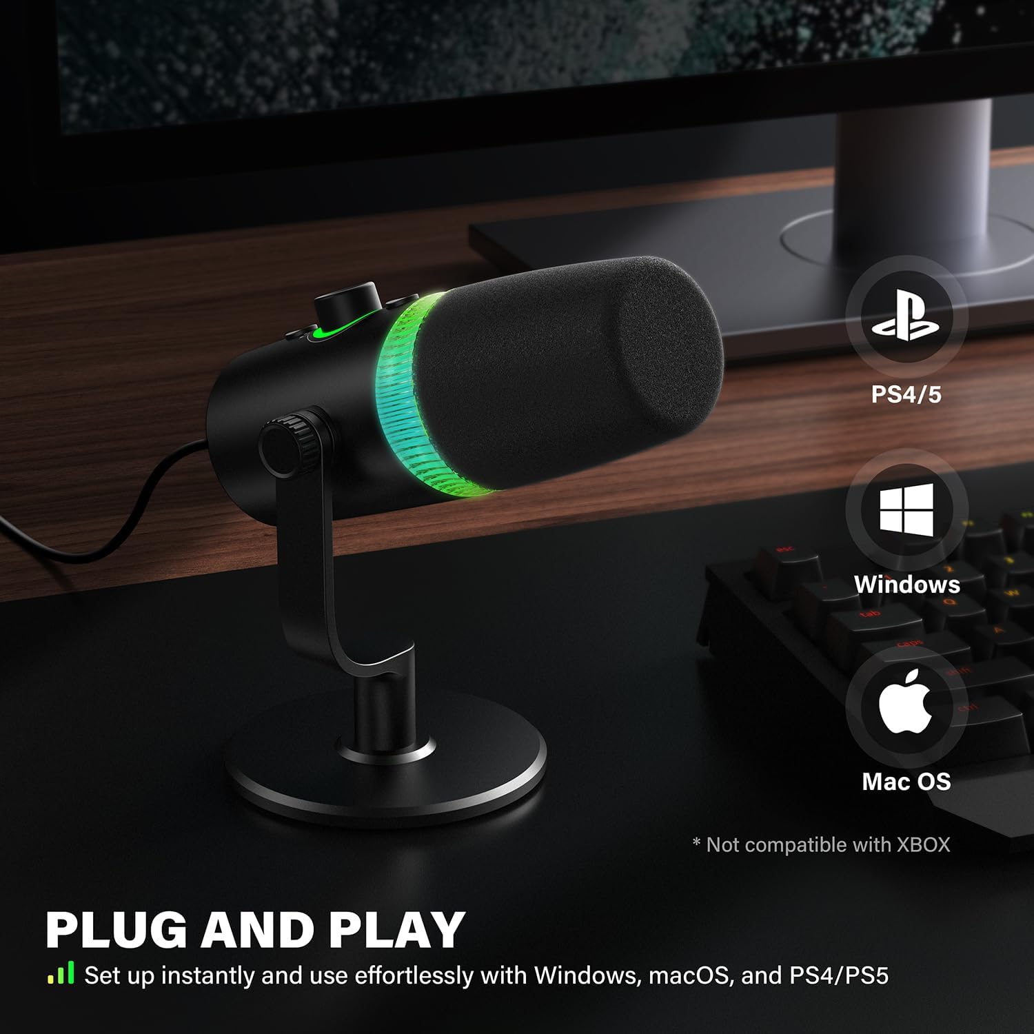 USB/XLR Dynamic Microphone Podcast & Gaming Microphone for PC, Vocal Mic with RGB Lighting, Tap-to-Mute, Gain Control & Headphone Monitoring for YouTube Streaming