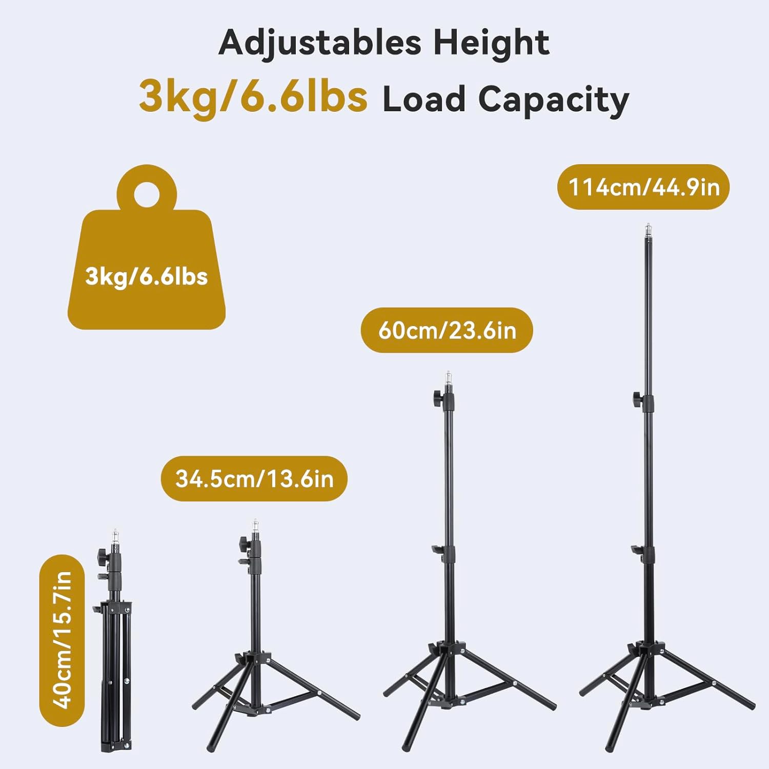 【2 Pack Light Stands for Photography】Our adjustable light stands can extend from 15.7 inches (40cm) to 44.9 inches (114cm), offering flexible height options for studio portraits, live streaming, or outdoor photography.