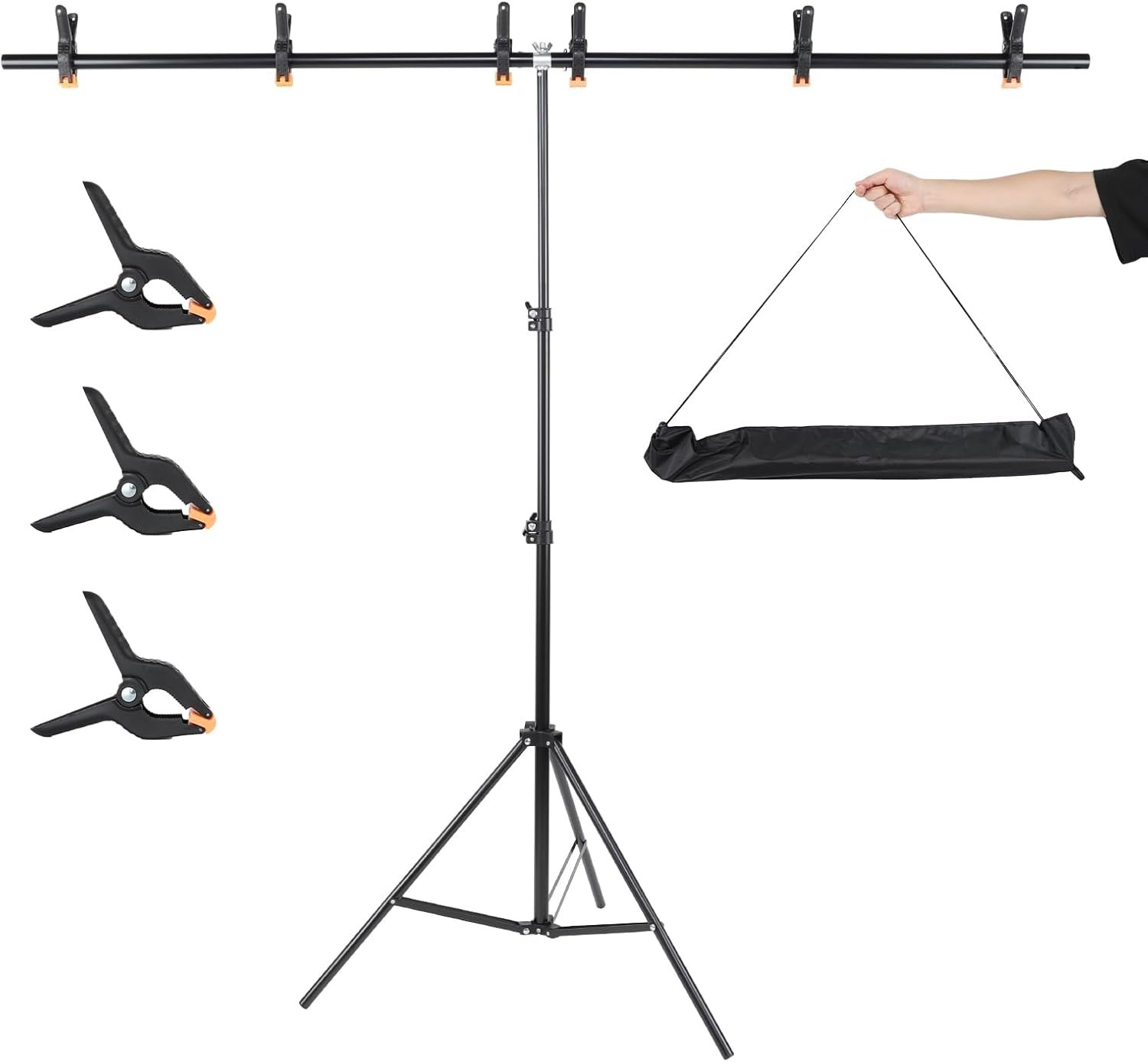 【Package Includes】The photo backdrop stand kit contains tripod*1, horizontal poles*2, spring clips*3, carrying bag*1. When shooting, the matching clip can clamp any item tightly on the bracket, presenting a better shooting effect.