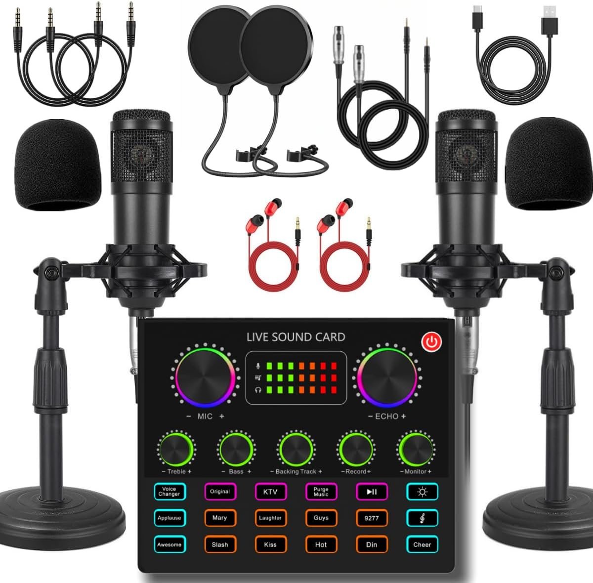 Package List – 1 * V8max sound board, 2 * condenser microphone, 2 * desktop microphone stand, 2 * 3.5mm earphone, 2 * microphone shock holder, 2 * microphone pop filter, 2 * microphone head cover foam, 2 * XLR to 3.5mm cable, 1 * USB charge cable, 2 * 3.5mm audio cable, 1 * User’s manual.