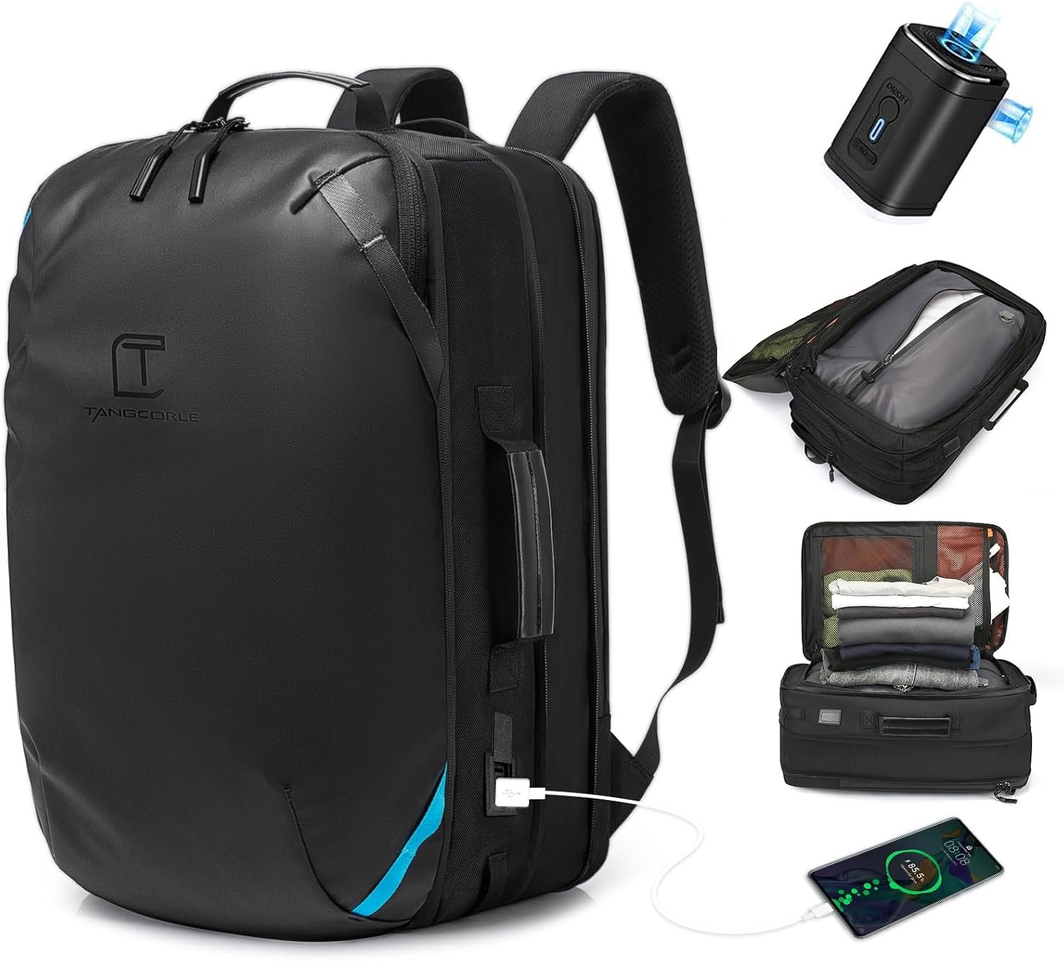 【Space Saving】Travel backpack for men with vacuum sealed compartments, you can save 80% of clothing storage space after compression, you don’t need to worry about can not to hold more clothes. You can manually press the air release or use the vacuum pump for faster compression, easy to operate. Please note: If the pump does not work, please charge it and try again.