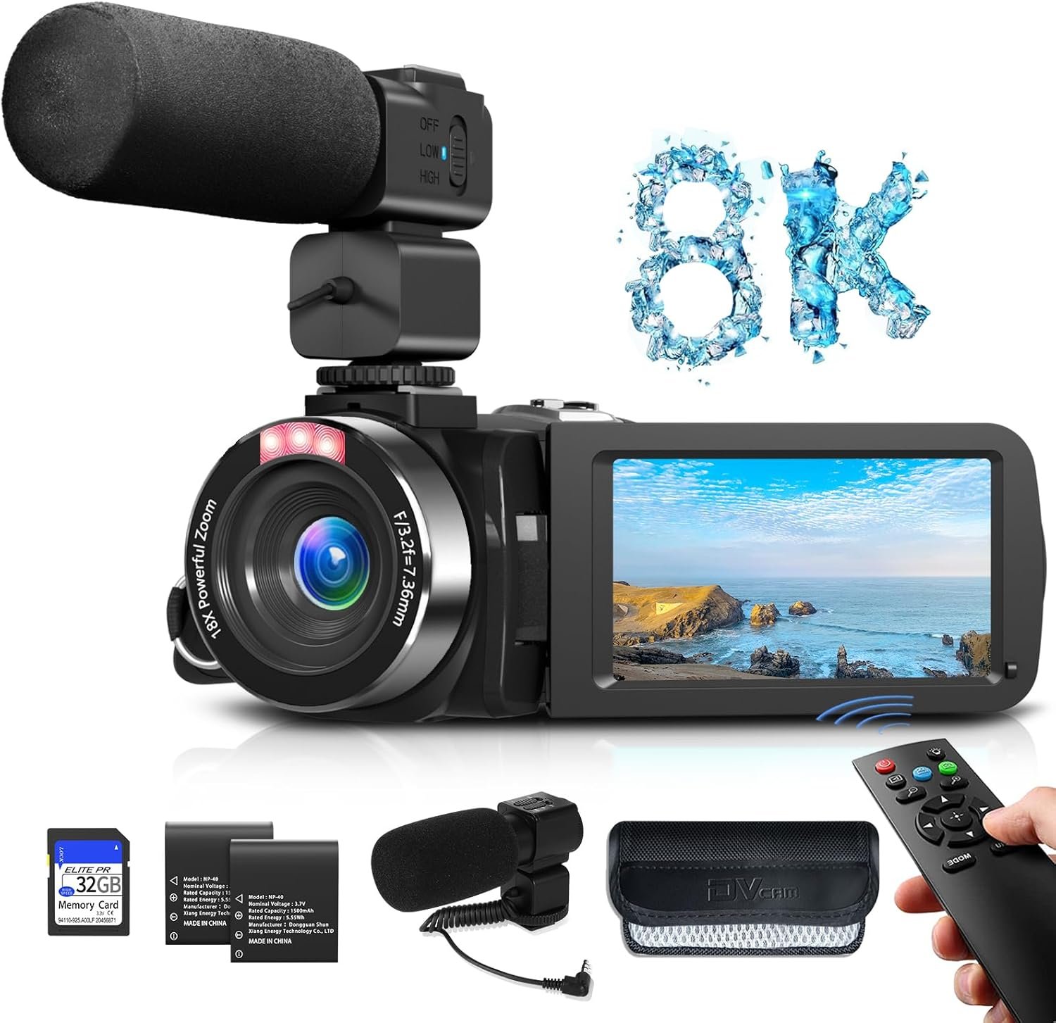 【8K & 48MP Video Camera】 The camcorder produces video at QHD 8K resolution and 48MP photos. It features a 3-inch/270-degree rotating screen and 18x digital zoom. The video recorder camcorder comes with a 32GB high-speed memory card specifically designed for cameras, with support for expansion up to 256GB. This vlog camera is the perfect companion for exploring this beautiful world! Great for traveling, meetings, studying, and capturing lovely moments.
