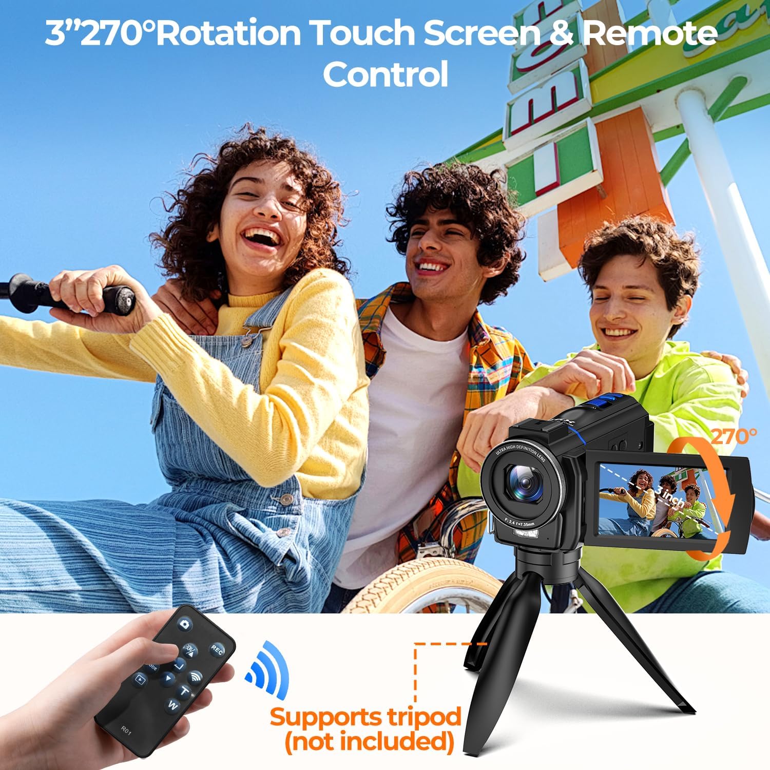 【270° Rotatable Touchscreen & Portable Design】Framing shots and reviewing footage is effortless with the 3-inch IPS touchscreen that rotates 270 degrees. This 4k camcorder is lightweight and designed for handheld use, making this camera for vlogging perfect for recording your adventures over extended periods without fatigue.