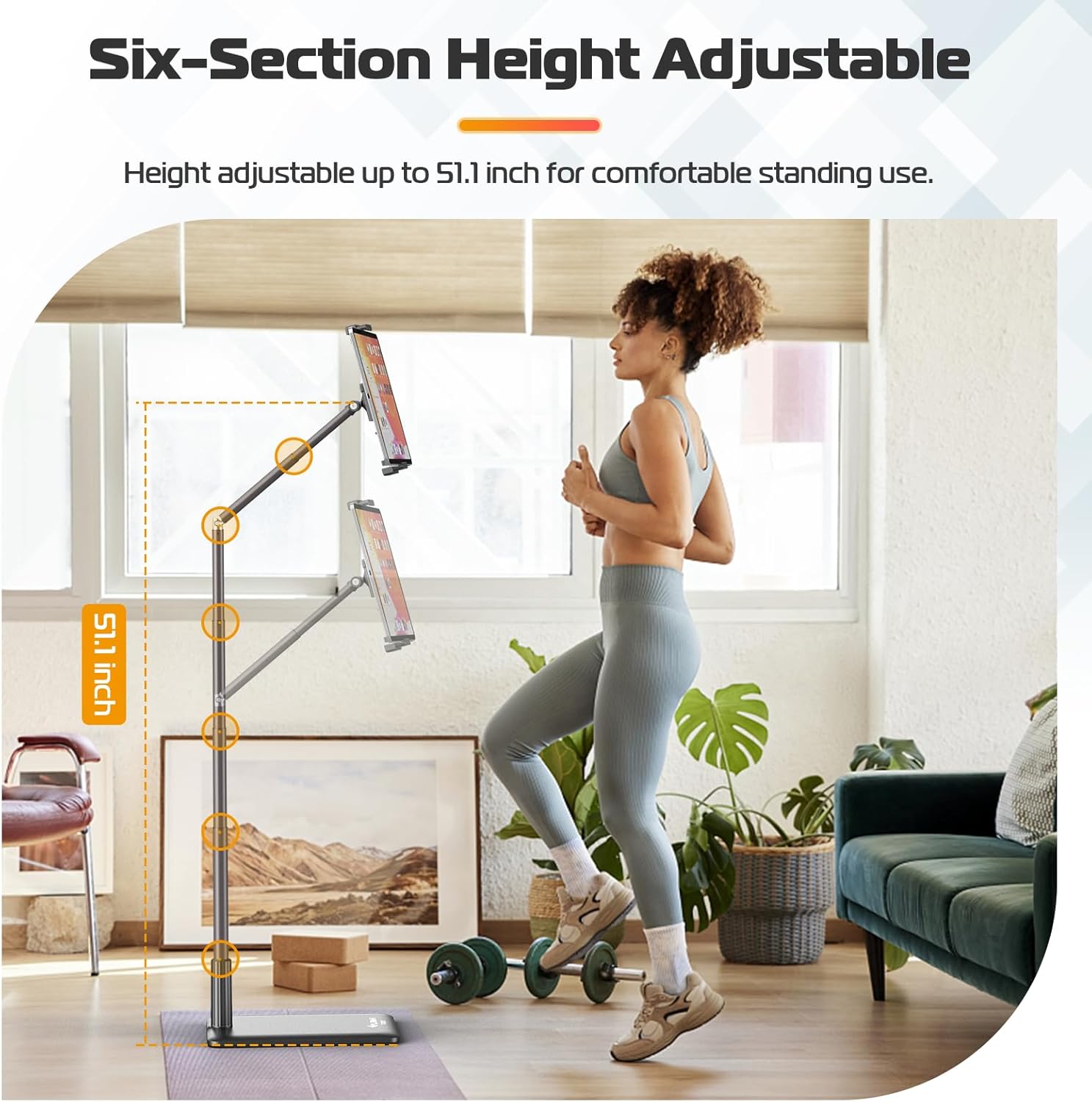 Easy to Use: No installation required. The kindle floor holder is adjustable up to 51inch/130cm in height, making it suitable for standing use, and the easy lift design allows you to effortlessly adjust it to the desired height.