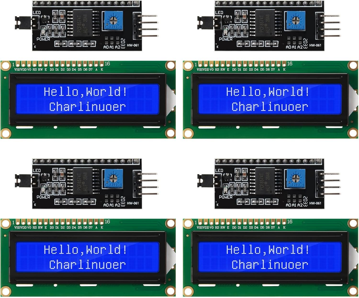 Default Address: 0 x 27 for PCF8574T chip; 0 x 3F for PCF8574AT chip; Please kindly check the chip of the i2c interface; ( Please remember to download the I2C library on GitHub before uploading the code to the control board)