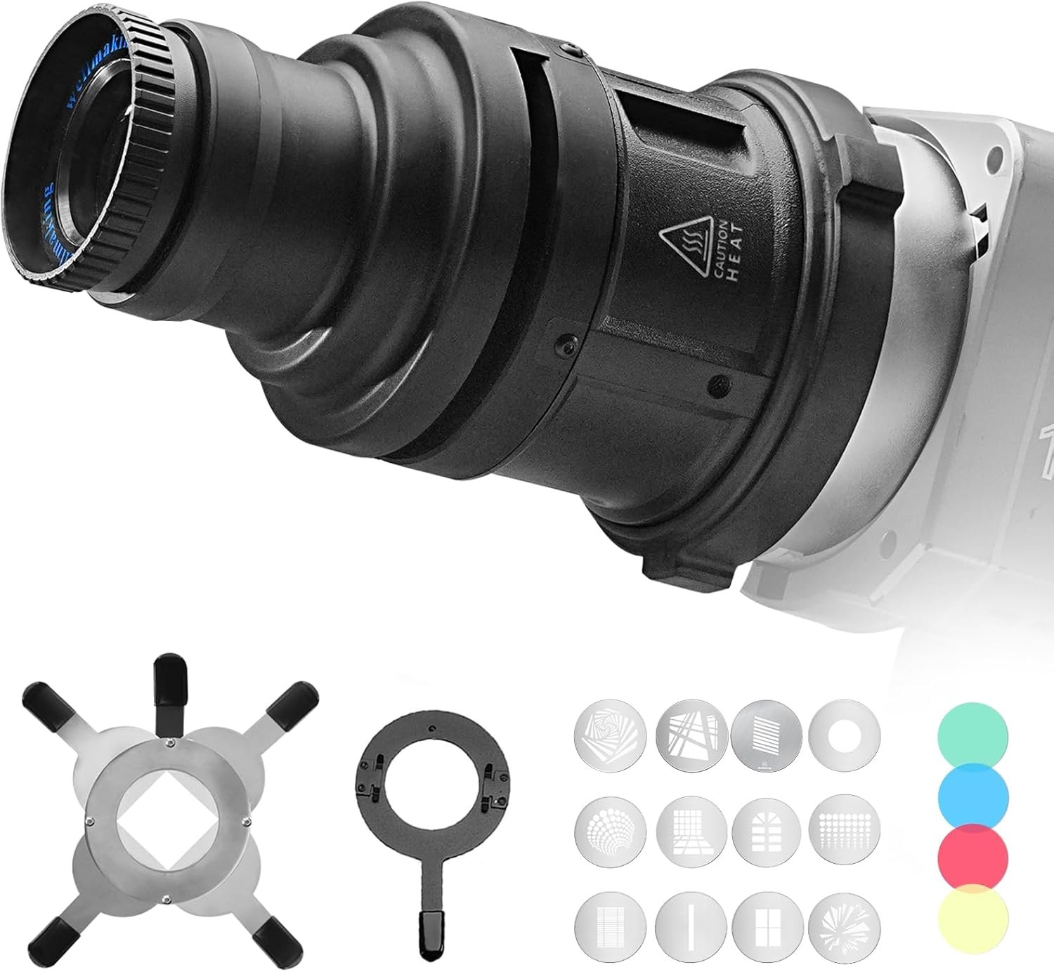 【Kit Includes】 1 × S-80 Bowens Mount Optical Snoot, 1× Projection lens 38°, 4 × Color Effects set, 1 × Gobo Holder, 12 × Gobo Effects set, 1 × Geometry Effect Modifier