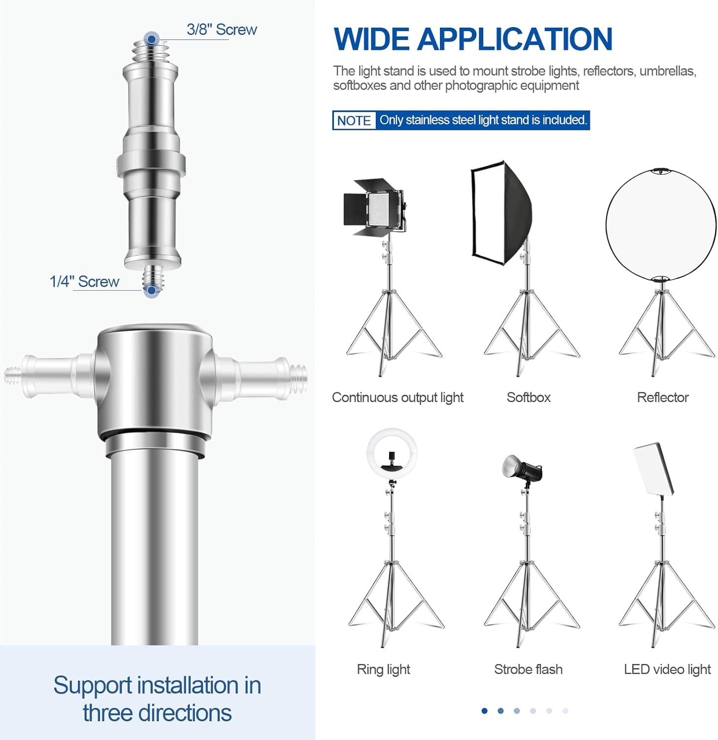 The inclusion of both 3/8 and 1/4 screw mounts on the light stand broadens its compatibility with a wide range of photographic and video accessories.