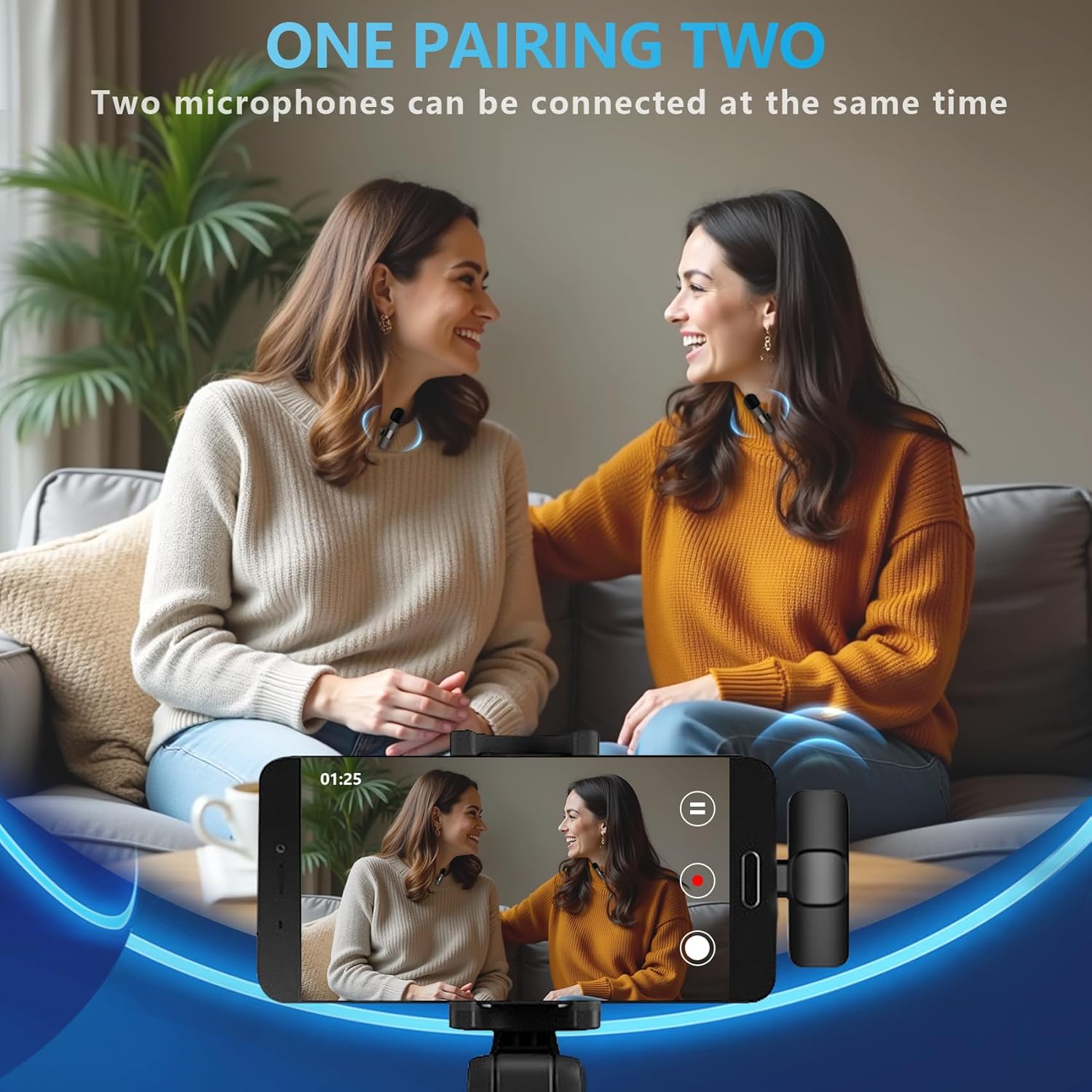 Compatible Devices Type-C (Android Devices), iOS Battery Life 6 hours Charging Time 1.5 hours Package Includes 4 x Sponge heads, 2 x Wireless Lavalier microphones, 1 x Lightning receiver, 1 x USB TYPE-C receiver, 1 x charging cable, 1 x portable drawstring bag, and 1 x user manual Connection Automatic Wireless Connection Charging Cable Type-C