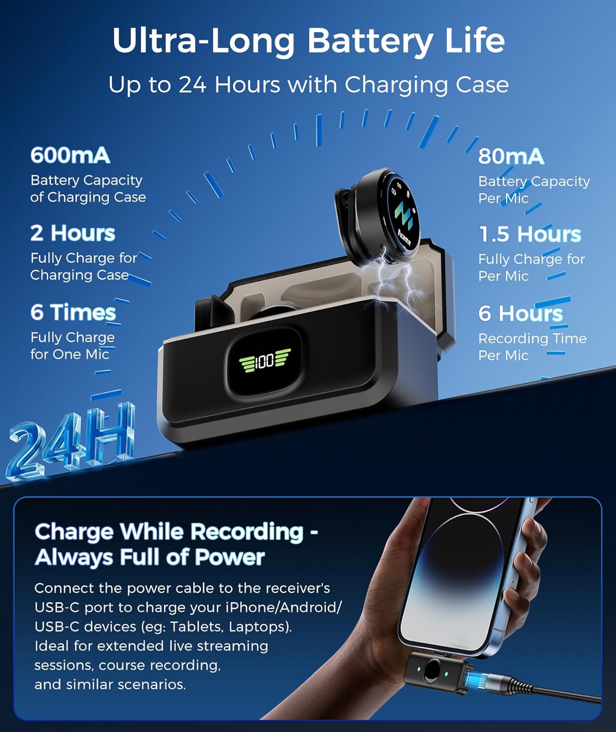 【All-Day Extended Battery Life】Each microphone delivers up to 6 hours of continuous operation and the charging case provides up to 6 times fully charge for a single microphone, extending total battery life to 24 hours for seamless recording during extended shoots. Also, the receiver’s USB-C port supports continuous power supply via a charging cable, enabling uninterrupted recording. (Note: The charging case fully charges in 2 hours; each microphone fully charges in 1.5 hours.)