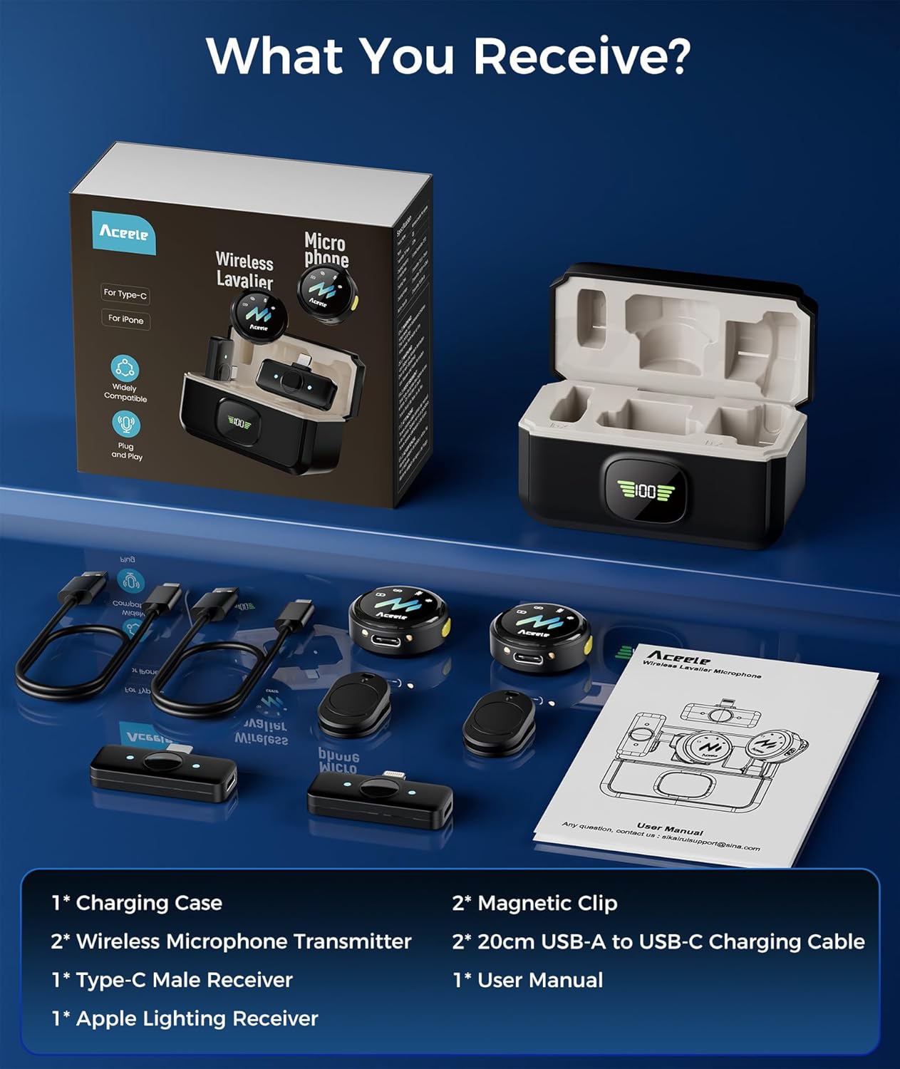 【Plug & Play】Wireless microphones & receiver Equipped with both USB-C and Lightning receivers, compatible with iPhone, iPad and Android System phones and tablets, as well as other mobile devices with a USB-C port (eg: laptops, PCs, etc.). No app, cables, WiFi, or Bluetooth required, simply plug the receiver (USB-C or Lightning) into your phone, connect it to the microphone and then start recording.