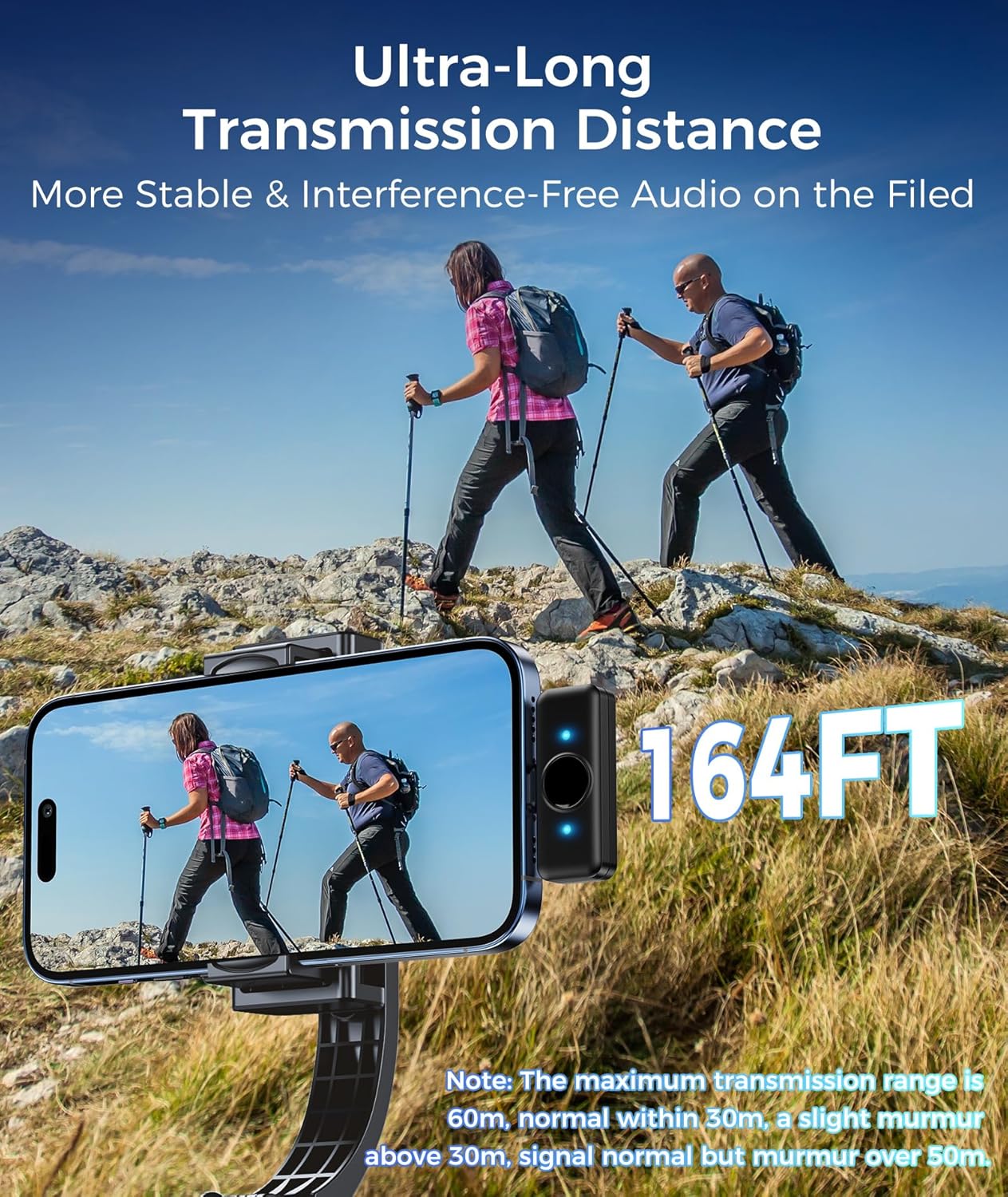 【164FT Ultra-Long Connection Range】Microphone Wireless utilizes a 2.4G transmission protocol, it delivers stable signals with strong anti-interference capabilities. With latency below 20ms, audio and video remain synchronized. In unobstructed environments, the lapel mic and receiver maintain a stable connection within a maximum transmission range of 50 meters, making it ideal for outdoor video records, interviews, live events, and mobile content creations. (Note: The maximum transmission range is 60m, normal within 30m, a slight murmur above 30m, signal normal but murmur over 50m.)