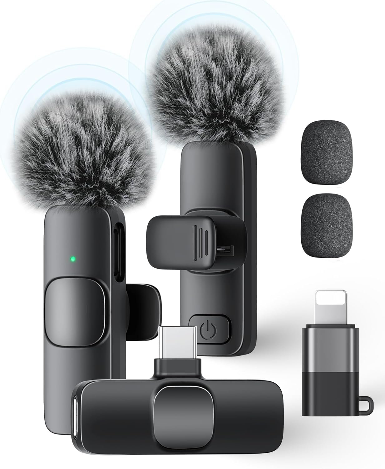 Omnidirectional Sound Pickup: Equipped with high-density windproof foam and a high-sensitivity microphone, it records every sound detail clearly, regardless of the surrounding environment. The package includes 2 lapel microphones, allowing two people to participate in video recording simultaneously.