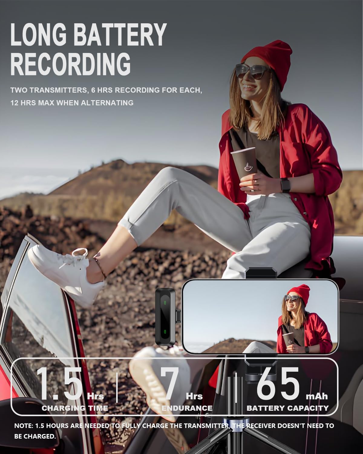 ULTRA-LONG BATTERY LIFE WORRY-FREE RECORDING ▎JCHIEN Wireless lavalier microphone equipped with a 60mAh large-capacity battery, a single transmitter can provide 6-12 hours of long-lasting battery life, easily coping with long meetings, interviews or outdoor shooting. it comes with a 1-TO-2 charging cable, which supports fast charging of dual transmitters at the same time, saving time and efficiency. the receiver is equipped with a usb-c charging port, which can not only connect to an external power source to ensure continuous operation of the device, but also charge the mobile phone in an emergency, completely saying goodbye to power outage anxiety.