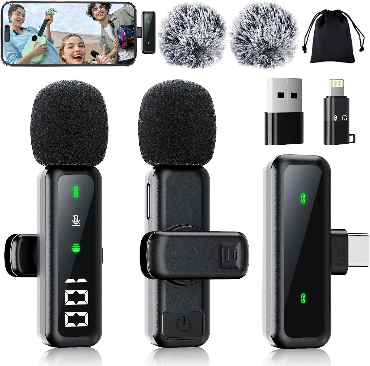 Dual Wireless Microphones + Complete Accessories Package: 2-pack includes: 2 transmitters, 1 USB-C receiver, Lightning/USB-A adapters, 2 windproof fur covers, dual charging cable, storage bag. Perfect for two-person interviews, couple vlogs, team presentations. Portable and ready for any recording situation