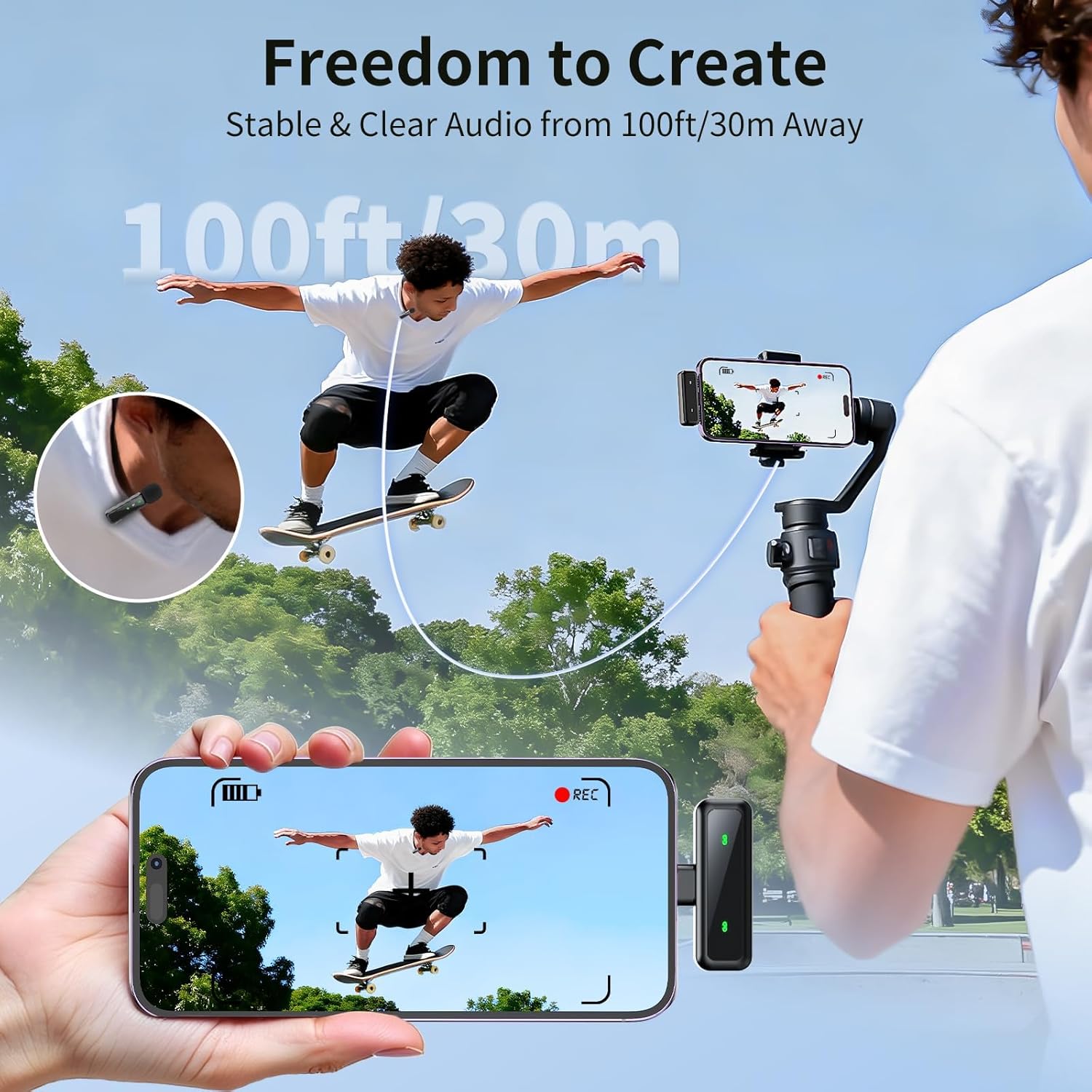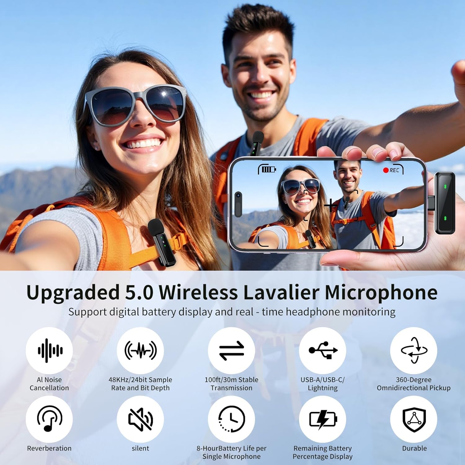 4 Audio Modes + Versatile Features for All Recording Scenarios: 4 audio modes (Original/Noise Reduction/Mute/Reverb) for vlogging, singing, interviews, online classes, podcasting. Real-time monitoring via headphone jack. Charge-while-recording function. 100ft/30m wireless range for outdoor shoots and interviews. Clip-on design for easy attachment