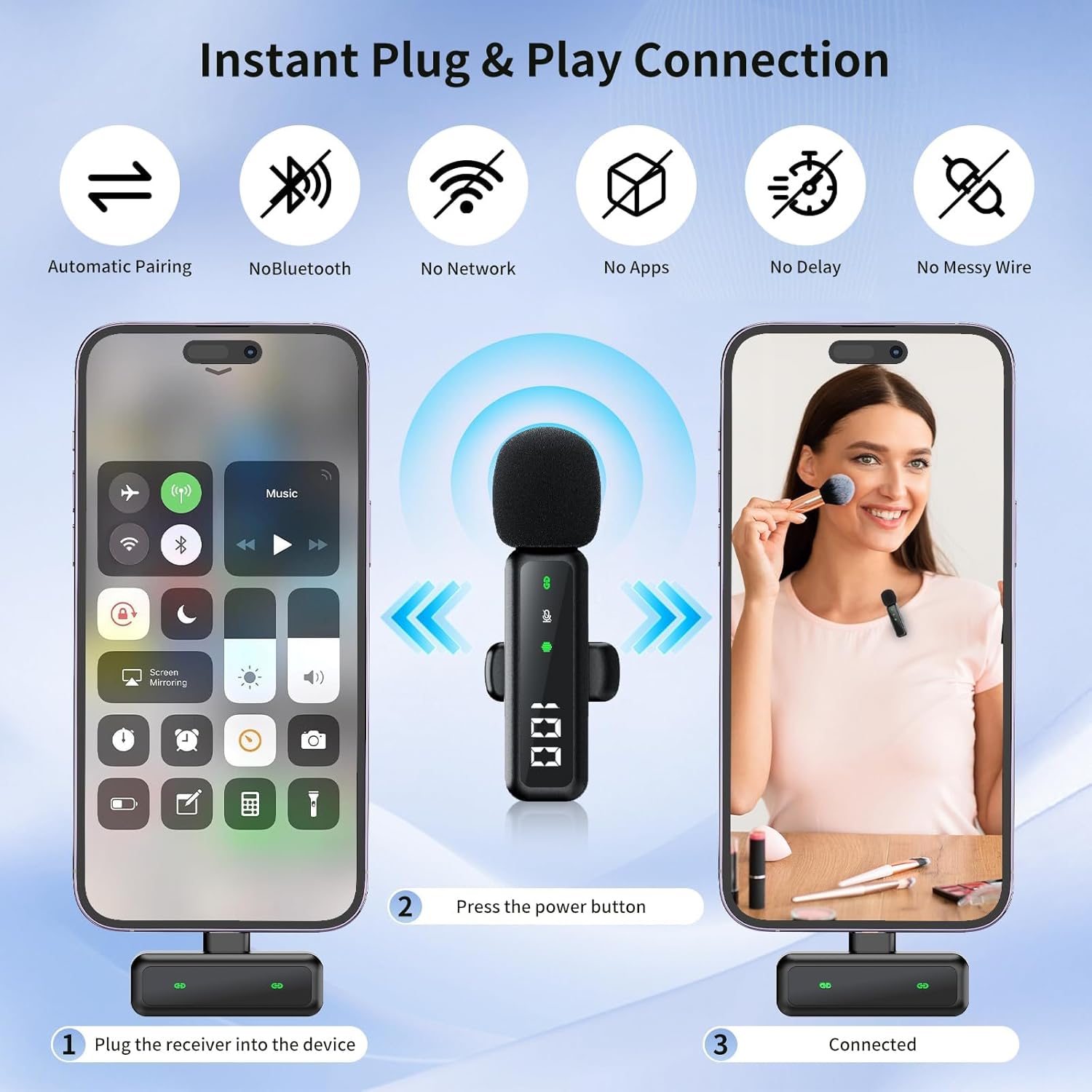 Plug & Play + Universal Compatibility for iPhone, Android, iPad: Auto-pair in 1 second—just plug receiver into your iPhone, Android, Pad, Mac or PC. No Bluetooth, APP, or network needed. Zero latency for smooth vlogging and recording. Includes USB-C/Lightning/USB-A adapters, compatible with iPhone 17/16/15/14, Samsung, Google Pixel, iPad Pro. Perfect for TikTok, YouTube creators