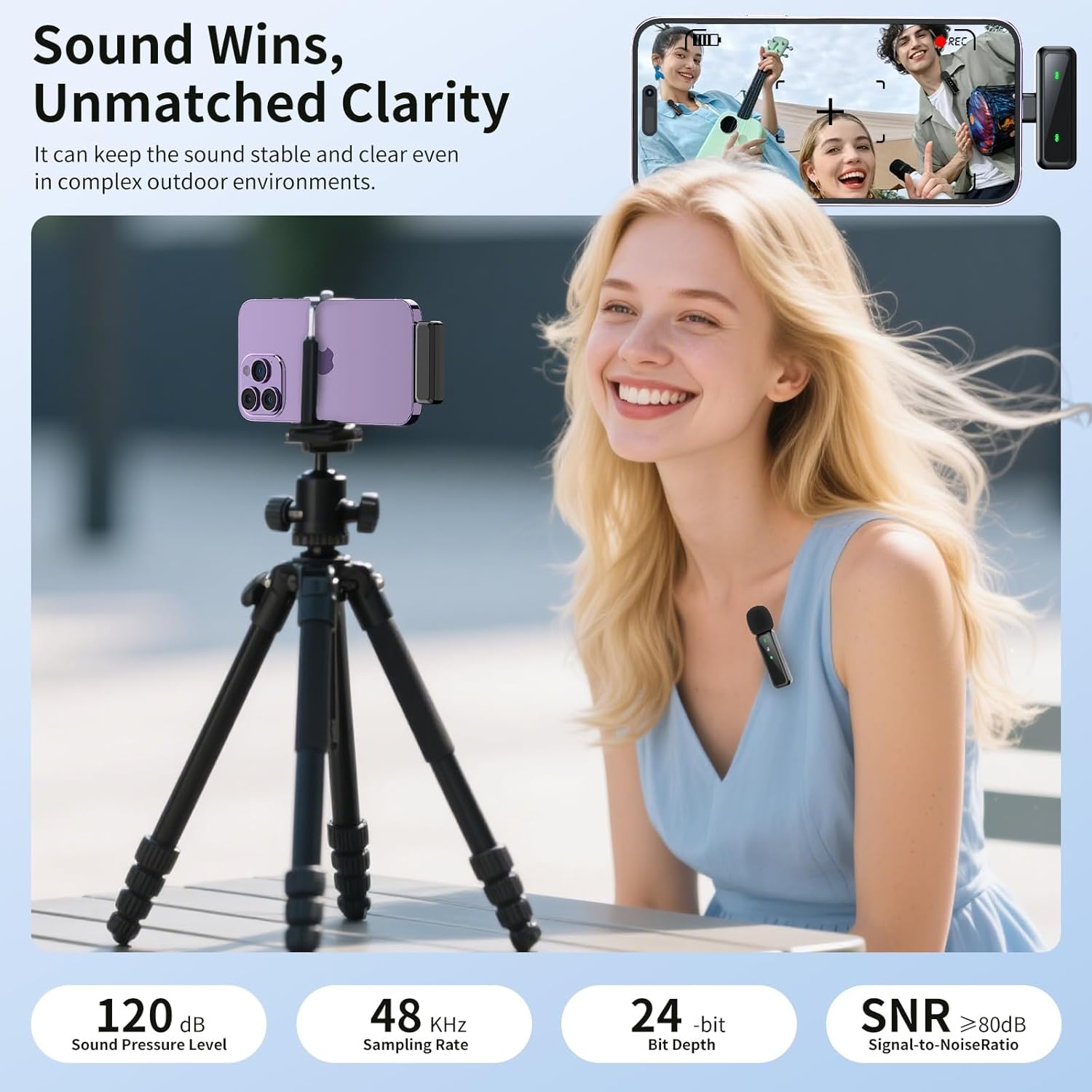 Studio-Grade Wireless Lavalier Microphone with AI Noise Cancellation: Crystal-clear audio for iPhone and Android devices. Features 48KHz/24bit high-fidelity sampling, 20-20KHz full frequency response, and SNR≥80dB. Built-in DSP chip and -38dB omnidirectional mic capture every detail. One-click AI noise reduction filters wind, traffic, crowd noise—perfect for outdoor vlogs, live streams, and content creation. Includes windproof fur covers for enhanced wind noise cancellation