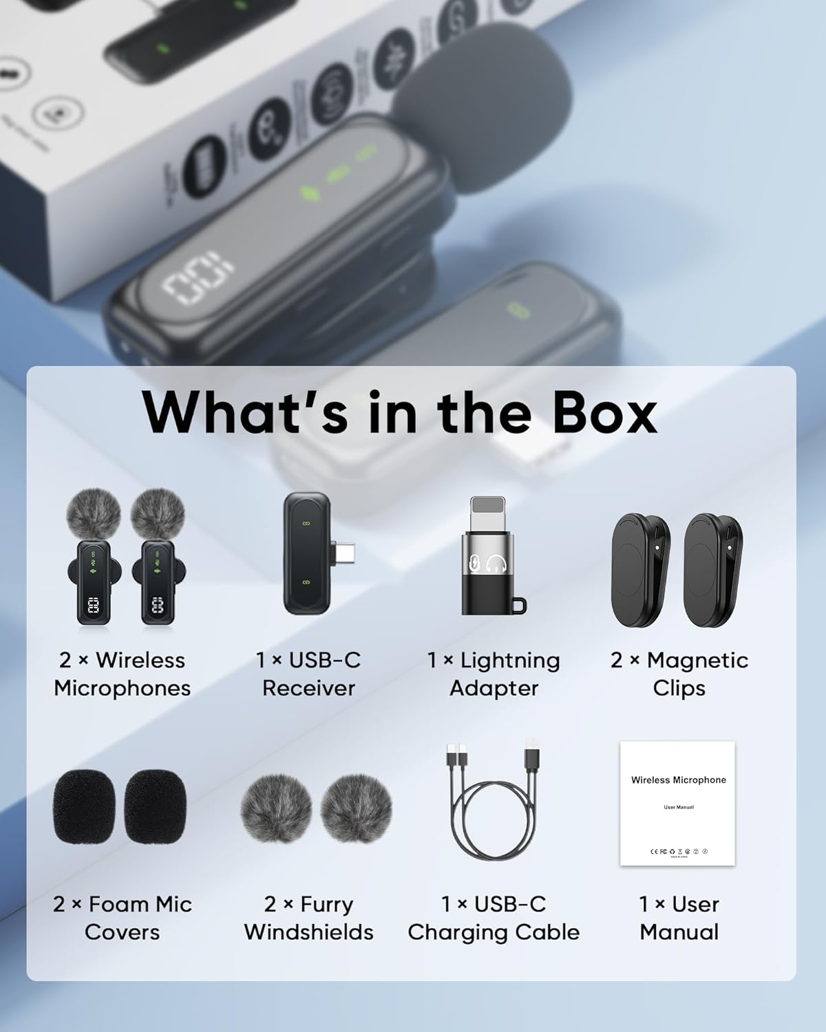 🎁 All-in-One Mic Kit – Record Like a Pro, Anywhere: Your complete wireless microphone set includes: 2 wireless mics, 1 USB-C receiver, 1 Lightning adapter, 2 magnetic clips, 2 foam windscreens, 2 furry windscreens, USB-C cable, and user manual. Ready for YouTube, TikTok, interviews, and more.