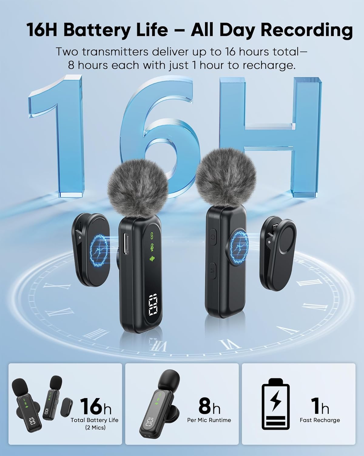 Each mic runs up to 8 hours on a single charge and fully recharges in just 1 hour. Need longer sessions? Switch between the two mics for up to 16 hours of nonstop recording.