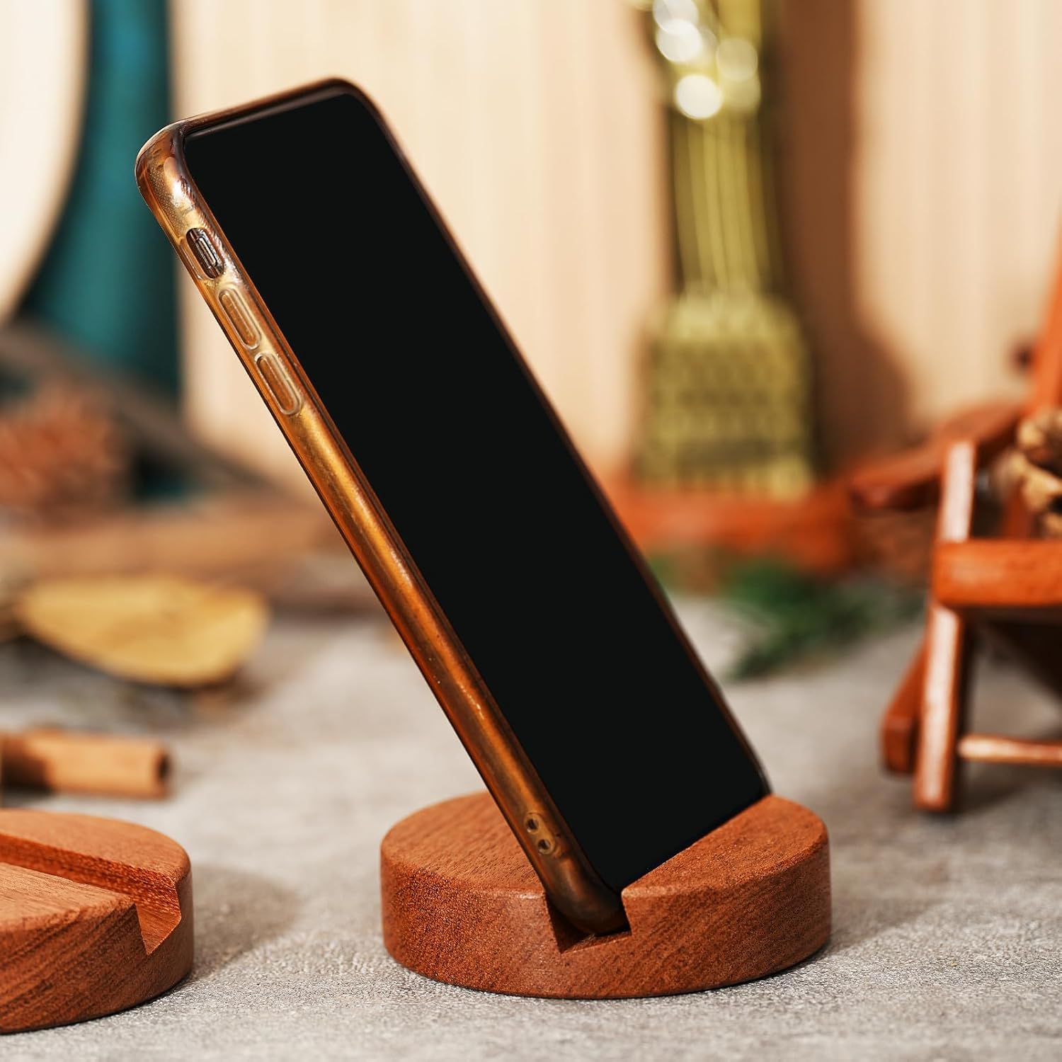 Wooden Cell Phone Stand,Desktop Portable Phone Holder Compatible with iPhone 15 Pro Max 14 Plus 13 12 se,Natural Wood Smartphone Holder for Desk Office (Circle Stand)