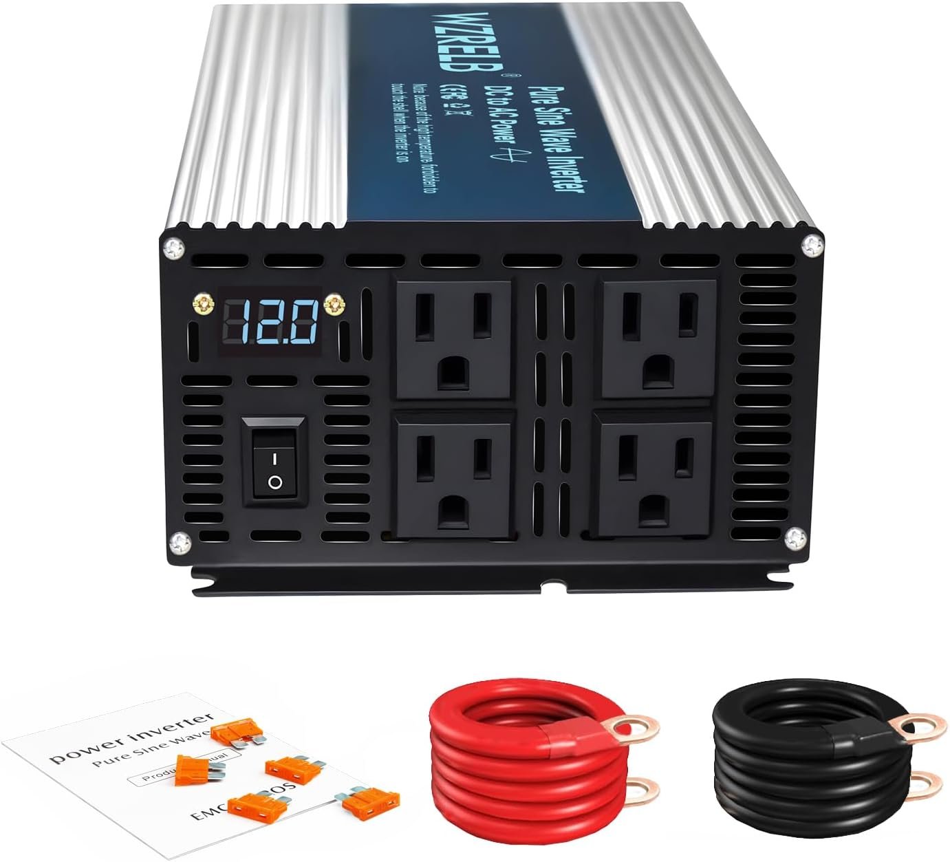 WZRELB 2000W Pure Sine Wave Inverter 12V DC to 110V 120V AC Power Converter with LED Display, Off-Grid Portable Power Inverter with 4 AC Outlets for Home, RV, Truck, Camping 【Pure Sine…