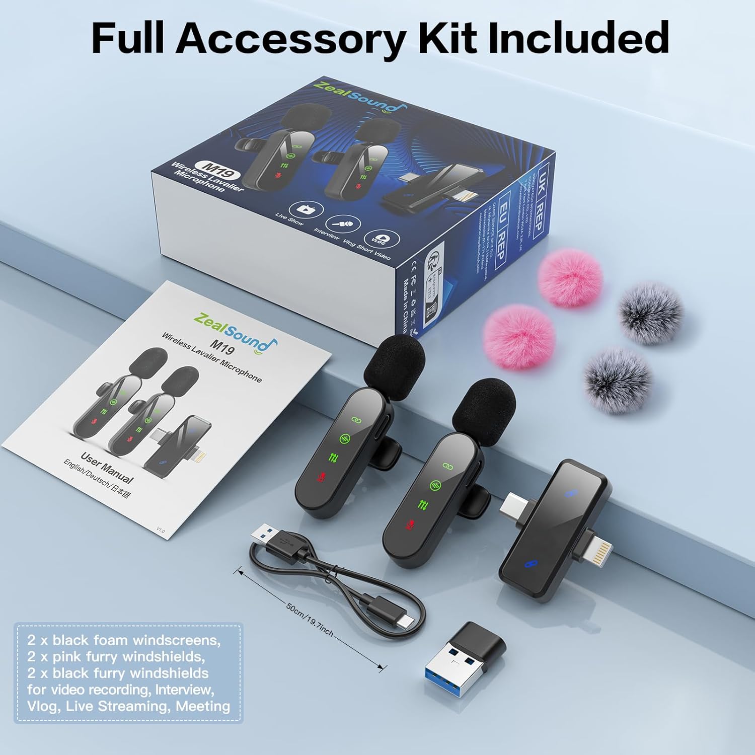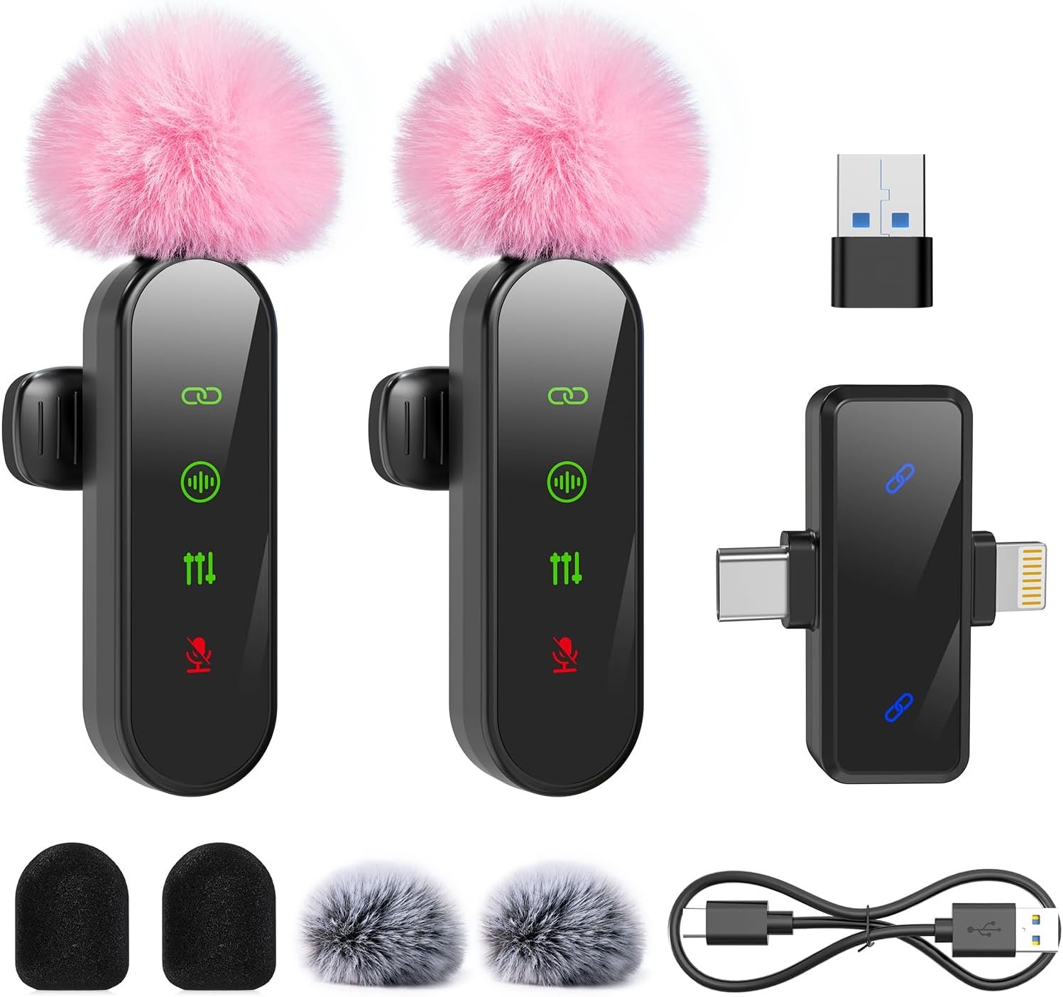 【Complete Creator Kit for On-the-Go Recording】 Everything you need to start creating right out of the box: 2 wireless microphones (transmitters), 1 dual-interface receiver (USB-C & Lightning), 1 USB adapter, 2 black foam windscreens, 2 pink furry muffs, 2 black furry muffs, and 1 charging cable. Perfect for mobile journalists, content creators, educators, and filmmakers, this reliable setup is ideal for interviews, documentaries, classroom recordings, travel vlogs, or any on-location production—wherever your story takes you.