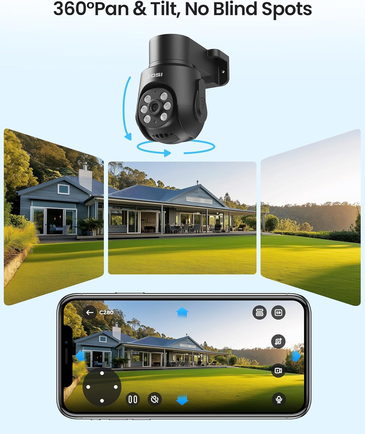 (2). [ 360° Pan & 140° Tilt for Full Coverage ]__ The Pan/Tilt design allows 360° horizontal rotation and 140° vertical tilt, letting you monitor every angle without blind spots. One camera easily covers wide areas such as yards, driveways, shops, or hallways, reducing the need for multiple units. Notice: For smooth and reliable pan/tilt operation, this camera requires a 2-in-1 BNC video + DC power Siamese cable made of CCA (copper-clad aluminum) or pure copper, ensuring stable power delivery.