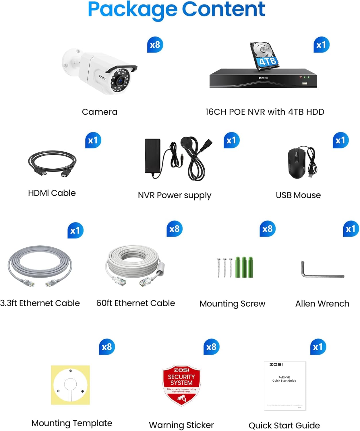 【16 PoE Ports, Expandable to 32 Cameras】- Scalable for Large Properties: Start with 8pcs 4K cameras and expand up to 32 with an additional PoE switch (supports ZOSI 8MP/5MP cameras).Plug-and-Play Setup: Includes PoE cables for easy installation—no extra wiring needed.