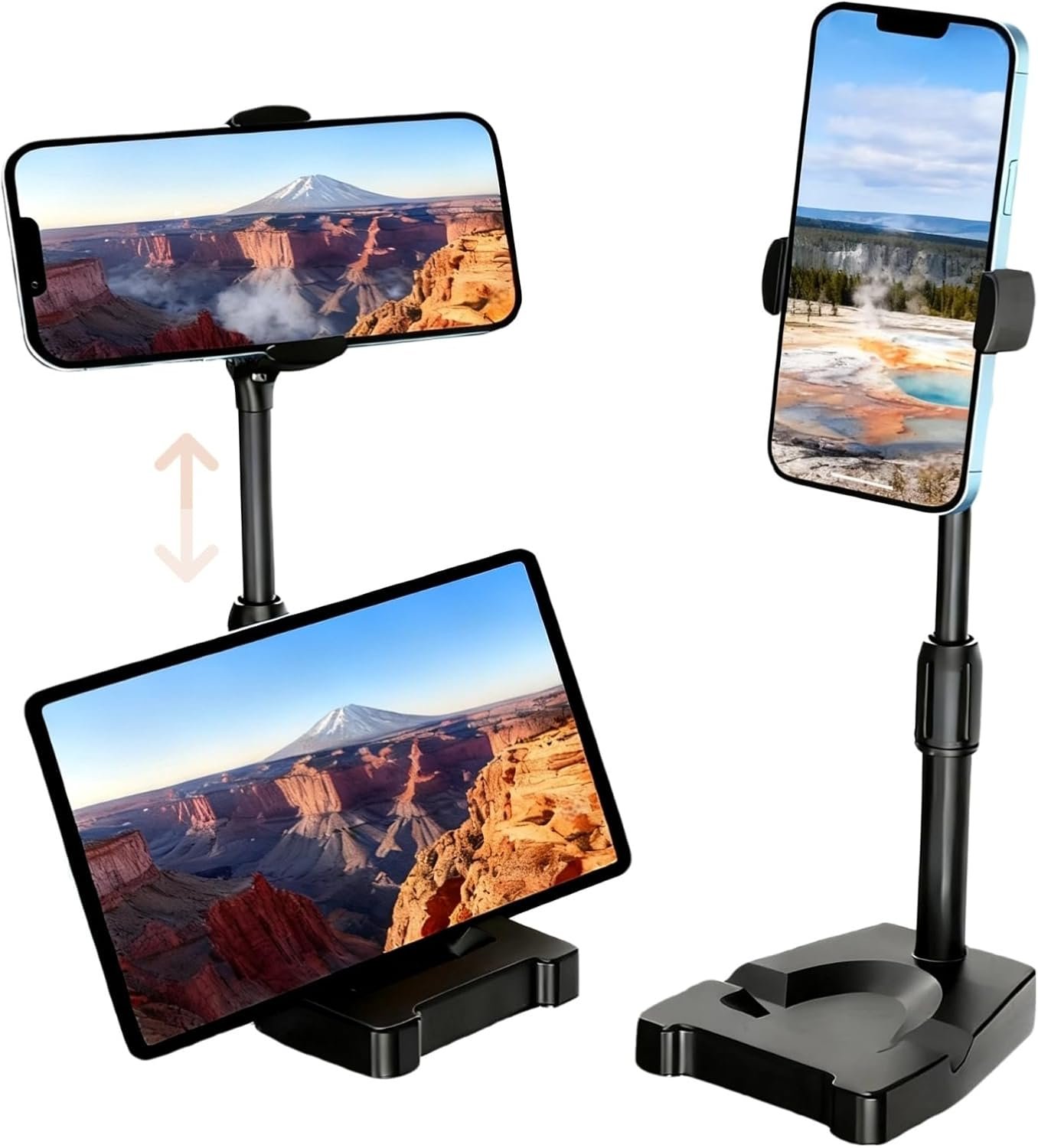 Streamline your workspace with this versatile adjustable stand. Designed to hold both your phone and tablet simultaneously, it offers height adjustability and flexible viewing angles for optimal ergonomics.